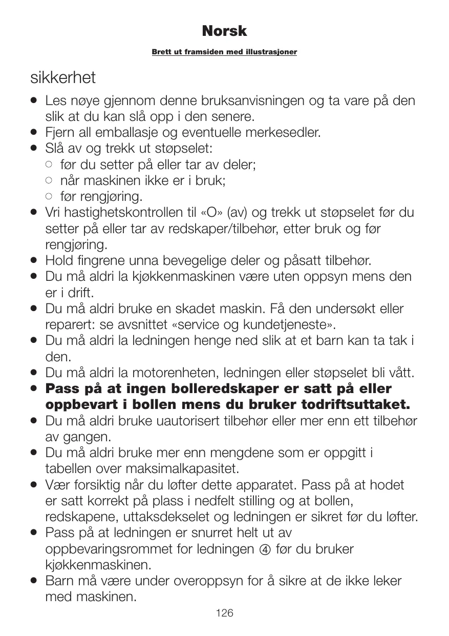 Les nøye gjennom denne bruksanvisningen og ta vare på den slik at du kan slå opp i den senere. Fjern all emballasje og eventuelle merkesedler. Slå av og trekk ut støpselet: l før du setter på eller tar av deler; l når maskinen ikke er i bruk; l før rengjøring. Vri hastighetskontrollen til «O» (av) og trekk ut støpselet før du setter på eller tar av redskaper/tilbehør, etter bruk og før rengjøring. Hold fingrene unna bevegelige deler og påsatt tilbehør. Du må aldri la kjøkkenmaskinen være uten oppsyn mens den er i drift. Du må aldri bruke en skadet maskin. Få den undersøkt eller reparert: se avsnittet «service og kundetjeneste». Du må aldri la ledningen henge ned slik at et barn kan ta tak i den. Du må aldri la motorenheten, ledningen eller støpselet bli vått. Pass på at ingen bolleredskaper er satt på eller oppbevart i bollen mens du bruker todriftsuttaket. Du må aldri bruke uautorisert tilbehør eller mer enn ett tilbehør av gangen. Du må aldri bruke mer enn mengdene som er oppgitt i tabellen over maksimalkapasitet. Vær forsiktig når du løfter dette apparatet. Pass på at hodet er satt korrekt på plass i nedfelt stilling og at bollen, redskapene, uttaksdekselet og ledningen er sikret før du løfter. Pass på at ledningen er snurret helt ut av oppbevaringsrommet for ledningen 4 før du bruker kjøkkenmaskinen. Barn må være under overoppsyn for å sikre at de ikke leker med maskinen.