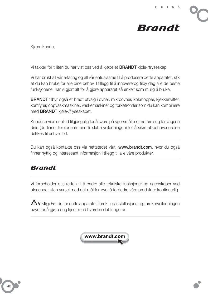 n o r s k Kjære kunde, Vi takker for tilliten du har vist oss ved å kjøpe et BRANDT kjøle-/fryseskap. Vi har brukt all vår erfaring og all vår entusiasme til å produsere dette apparatet, slik at du kan bruke for alle dine behov. I tillegg til å innovere og tilby deg alle de beste funksjonene, har vi gjort alt for å gjøre apparatet så enkelt som mulig å bruke. BRANDT tilbyr også et bredt utvalg i ovner, mikroovner, koketopper, kjøkkenvifter, komfyrer, oppvaskmaskiner, vaskemaskiner og tørketromler som du kan kombinere med BRANDT kjøle-/fryseskapet. Kundeservice er alltid tilgjengelig for å svare på spørsmål eller notere seg forslagene dine (du finner telefonnumrene til slutt i veiledningen) for å sikre at behovene dine dekkes til enhver tid. Du kan også kontakte oss via nettstedet vårt, www.brandt.com, hvor du også finner nyttig og interessant informasjon i tillegg til alle våre produkter. Vi forbeholder oss retten til å endre alle tekniske funksjoner og egenskaper ved utseendet uten varsel med det mål for øyet å forbedre våre produkter kontinuerlig. Viktig: Før du tar dette apparatet i bruk, les installasjons- og brukerveiledningen nøye for å gjøre deg kjent med hvordan det fungerer.