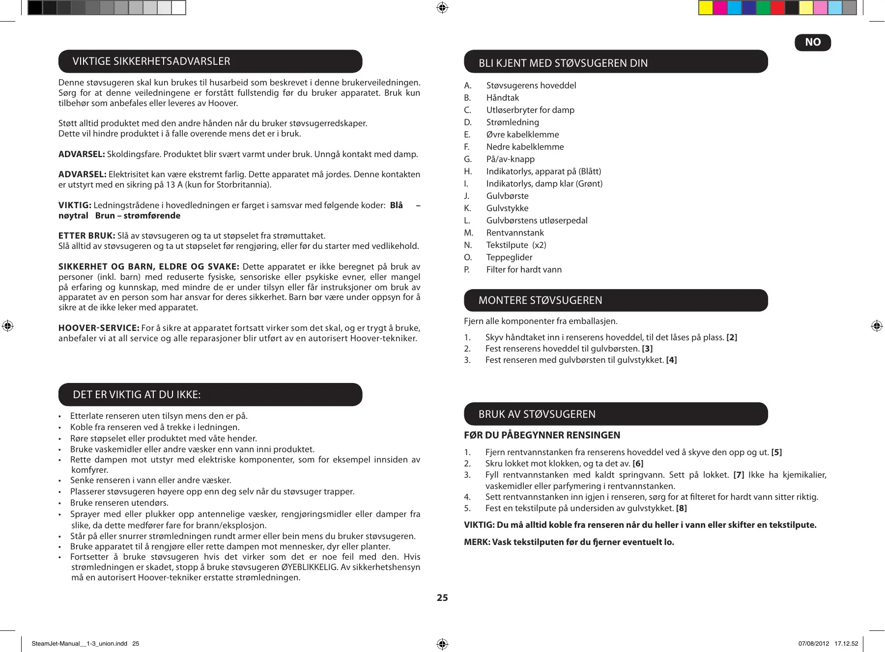 Hoover-service Hvis du på noe tidspunkt skulle trenge service, ber vi deg kontakte ditt lokale Hooverservicekontor. OFTE STILTE SPØRSMÅL OM RENGJØRING Når er dampstrålen klar? Etter omtrent 30 sekunder. Kvalitet Hoovers fabrikker har blitt uavhengig kvalitetsvurdert. Våre produkter produseres ved å bruke et kvalitetssystem som er i samsvar med ISO 9001. Kan jeg bruke damstrålen på alle gulvflater? På alle harde gulv, som f.eks. marmor, kjeramikk, stein, linoleum, forseglet tregulv og parkett. Miljøet: Dette apparatet er merket i henhold til EU-direktiv 2002/96/EF om kassering av elektrisk og elektronisk utstyr (WEEE-direktivet). Gjennom å sikre at dette produktet avhendes på riktig måte, bidrar du til å forhindre mulige negative følger for miljø og menneskelig helse som vil kunne oppstå dersom produktet avhendes på feilaktig måte. Slipper dampstrålen automatisk ut damp? Nei. For å produsere strøm må du trykke på utløsningsknappen for damp/kosting under håndtaket. Kan jeg bruke den vertikalt? Nei, dampstrålen kan kun brukes på horisontale gulvflater. Kan jeg bruke vaskemiddel og andre kjemikalier inni tanken? Nei, dette vil skade produktet. Symbolet på produktet angir at dette produktet ikke kan behandles som husholdingsavfall. I stedet skal det overleveres til egnede kildesorteringsanlegg for resirkulering av elektrisk og elektronisk utstyr. Avhending må utføres i samsvar med lokale miljøbestemmelser for avfallshåndtering. For mer informasjon om behandling, gjenvinning og resirkulering av dette produktet, ta kontakt med den kommunale etaten for avfallshåndtering eller butikken der du kjøpte produktet. Hva skjer hvis vannet i byen jeg bor i er veldig hardt? Du kan bruke filtrert vann, eller du kan være nødt til å skifte filterkassett oftere. Hvis du finner at dampen er svak, bør du sjekke yttersiden der dampen kommer ut. Du kan fjerne kalkbelegget ved å sette små verktøy inn i hullet om nødvendig. Når er det tid for å skifte ut filterkassetten? Hvordan vet man det? Det kommer an på hvor hardt vannet er. Vanligvis 6 måneder. Du merker at fargen på den gule harpiksen inne i filterkassetten blir noe uklar. Din garanti Garantibetingelsene for dette apparatet er som definert av vår representant i det landet der det ble solgt. Detaljer vedrørende disse betingelsene fås fra forhandleren der apparatet ble kjøpt. Salgskvitteringen må fremvises ved fremsetting av krav under betingelsene i denne garantien.. Kan endres uten forvarsel. Hvor lenge varer en tank med vann før den må fylles på nytt? Omtrent 20 minutter hvis utløseren er kontinuerlig trykket ned..