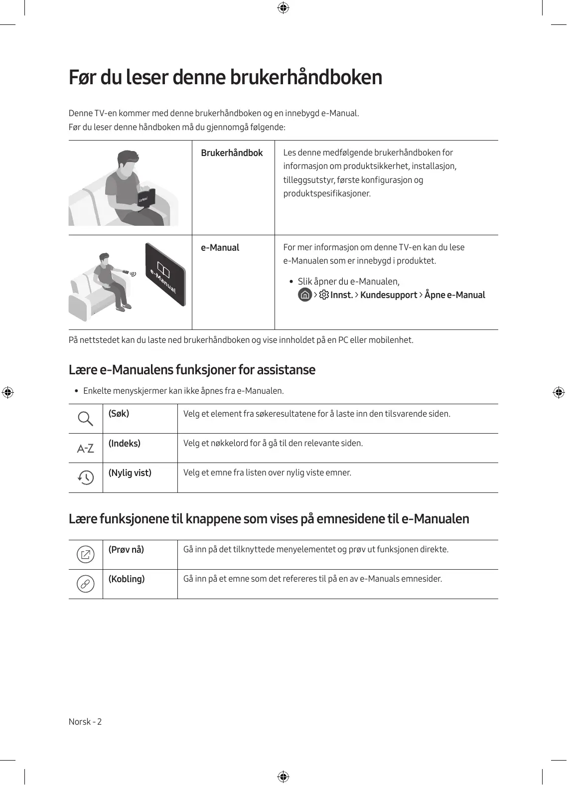- • Slik åpner du e-Manualen, > Innst. > Kundesupport > Åpne e-Manual På nettstedet kan du laste ned brukerhåndboken og vise innholdet på en PC eller mobilenhet. Lære e-Manualens funksjoner for assistanse