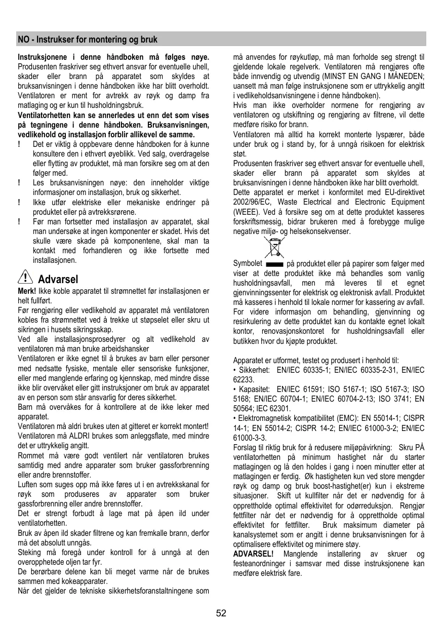 NO - Instrukser for montering og bruk må anvendes for røykutløp, må man forholde seg strengt til gjeldende lokale regelverk. Ventilatoren må rengjøres ofte både innvendig og utvendig (MINST EN GANG I MÅNEDEN; uansett må man følge instruksjonene som er uttrykkelig angitt i vedlikeholdsanvisningene i denne håndboken). Hvis man ikke overholder normene for rengjøring av ventilatoren og utskiftning og rengjøring av filtrene, vil dette medføre risiko for brann. Ventilatoren må alltid ha korrekt monterte lyspærer, både under bruk og i stand by, for å unngå risikoen for elektrisk støt. Produsenten fraskriver seg ethvert ansvar for eventuelle uhell, skader eller brann på apparatet som skyldes at bruksanvisningen i denne håndboken ikke har blitt overholdt. Dette apparatet er merket i konformitet med EU-direktivet 2002/96/EC, Waste Electrical and Electronic Equipment (WEEE). Ved å forsikre seg om at dette produktet kasseres forskriftsmessig, bidrar brukeren med å forebygge mulige negative miljø- og helsekonsekvenser. Instruksjonene i denne håndboken må følges nøye. Produsenten fraskriver seg ethvert ansvar for eventuelle uhell, skader eller brann på apparatet som skyldes at bruksanvisningen i denne håndboken ikke har blitt overholdt. Ventilatoren er ment for avtrekk av røyk og damp fra matlaging og er kun til husholdningsbruk. Ventilatorhetten kan se annerledes ut enn det som vises på tegningene i denne håndboken. Bruksanvisningen, vedlikehold og installasjon forblir allikevel de samme. Det er viktig å oppbevare denne håndboken for å kunne konsultere den i ethvert øyeblikk. Ved salg, overdragelse eller flytting av produktet, må man forsikre seg om at den følger med. Les bruksanvisningen nøye: den inneholder viktige informasjoner om installasjon, bruk og sikkerhet. Ikke utfør elektriske eller mekaniske endringer på produktet eller på avtrekksrørene. Før man fortsetter med installasjon av apparatet, skal man undersøke at ingen komponenter er skadet. Hvis det skulle være skade på komponentene, skal man ta kontakt med forhandleren og ikke fortsette med installasjonen. Symbolet på produktet eller på papirer som følger med viser at dette produktet ikke må behandles som vanlig husholdningsavfall, men må leveres til et egnet gjenvinningssenter for elektrisk og elektronisk avfall. Produktet må kasseres i henhold til lokale normer for kassering av avfall. For videre informasjon om behandling, gjenvinning og resirkulering av dette produktet kan du kontakte egnet lokalt kontor, renovasjonskontoret for husholdningsavfall eller butikken hvor du kjøpte produktet. Advarsel Merk! Ikke koble apparatet til strømnettet før installasjonen er helt fullført. Før rengjøring eller vedlikehold av apparatet må ventilatoren kobles fra strømnettet ved å trekke ut støpselet eller skru ut sikringen i husets sikringsskap. Ved alle installasjonsprosedyrer og alt vedlikehold av ventilatoren må man bruke arbeidshansker Ventilatoren er ikke egnet til å brukes av barn eller personer med nedsatte fysiske, mentale eller sensoriske funksjoner, eller med manglende erfaring og kjennskap, med mindre disse ikke blir overvåket eller gitt instruksjoner om bruk av apparatet av en person som står ansvarlig for deres sikkerhet. Barn må overvåkes for å kontrollere at de ikke leker med apparatet. Ventilatoren må aldri brukes uten at gitteret er korrekt montert! Ventilatoren må ALDRI brukes som anleggsflate, med mindre det er uttrykkelig angitt. Rommet må være godt ventilert når ventilatoren brukes samtidig med andre apparater som bruker gassforbrenning eller andre brennstoffer. Luften som suges opp må ikke føres ut i en avtrekkskanal for røyk som produseres av apparater som bruker gassforbrenning eller andre brennstoffer. Det er strengt forbudt å lage mat på åpen ild under ventilatorhetten. Bruk av åpen ild skader filtrene og kan fremkalle brann, derfor må det absolutt unngås. Steking må foregå under kontroll for å unngå at den overopphetede oljen tar fyr. De berørbare delene kan bli meget varme når de brukes sammen med kokeapparater. Når det gjelder de tekniske sikkerhetsforanstaltningene som Apparatet er utformet, testet og produsert i henhold til: