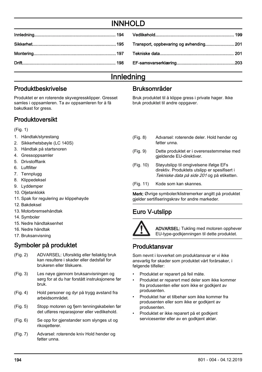 Produktoversikt (Fig. 1) 1. Håndtak/styrestang 2. Sikkerhetsbøyle (LC 140S) 3. Håndtak på startsnoren 4. Gressoppsamler 5. Drivstofftank 6. Luftfilter 7. Tennplugg 8. Klippedeksel 9. Lyddemper 10. Oljetanklokk 11. Spak for regulering av klippehøyde 12. Bakdeksel 13. Motorbremsehåndtak 14. Symboler 15. Nedre håndtaksenhet 16. Nedre håndtak 17. Bruksanvisning