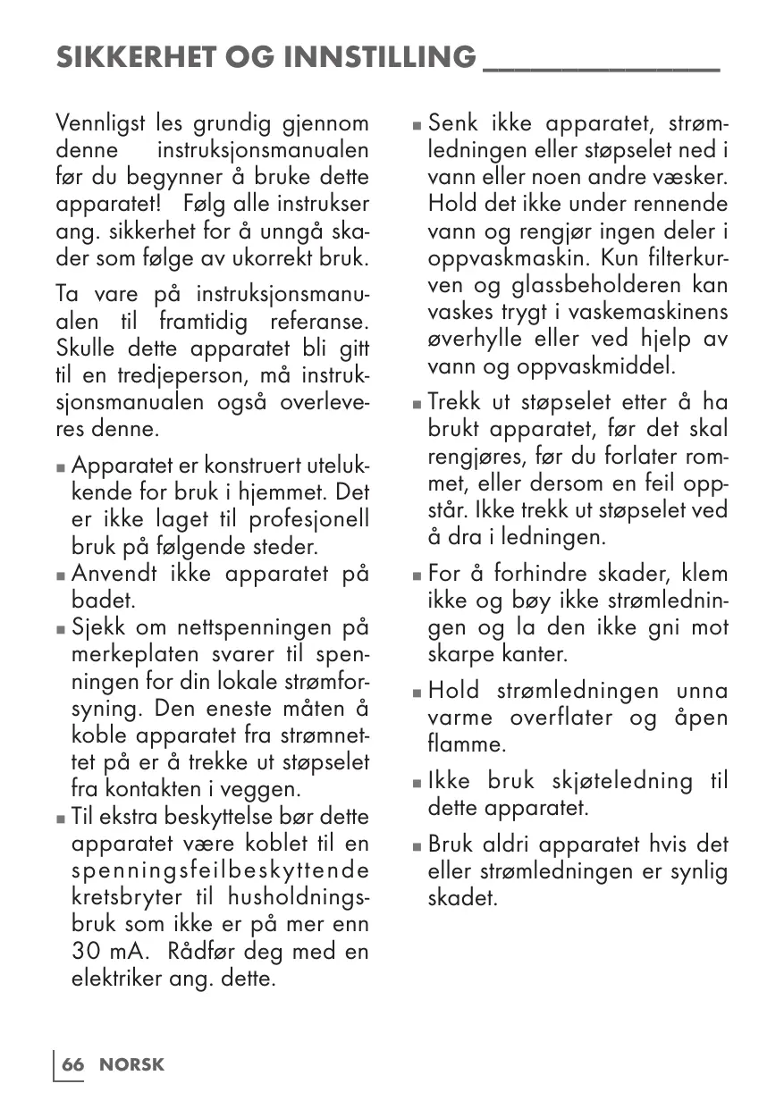 Conservez le manuel d'utilisation car vous pourriez en avoir besoin ultérieurement. Au cas où cet appareil change de propriétaire, remettez également le manuel d'utilisation au nouveau bénéficiaire. Le présent appareil est destiné à un usage domestique privé uniquement et ne saurait convenir à une utilisation professionnelle en restauration. Il ne doit pas être utilisé à des fins commerciales. N'utilisez pas l'appareil dans la salle de bain. Assurez-vous que la tension de secteur figurant sur la plaque signalétique correspond à votre alimentation secteur locale. Le seul moyen de déconnecter l'appareil de l'alimentation est de retirer la fiche d'alimentation électrique de la prise de courant murale.