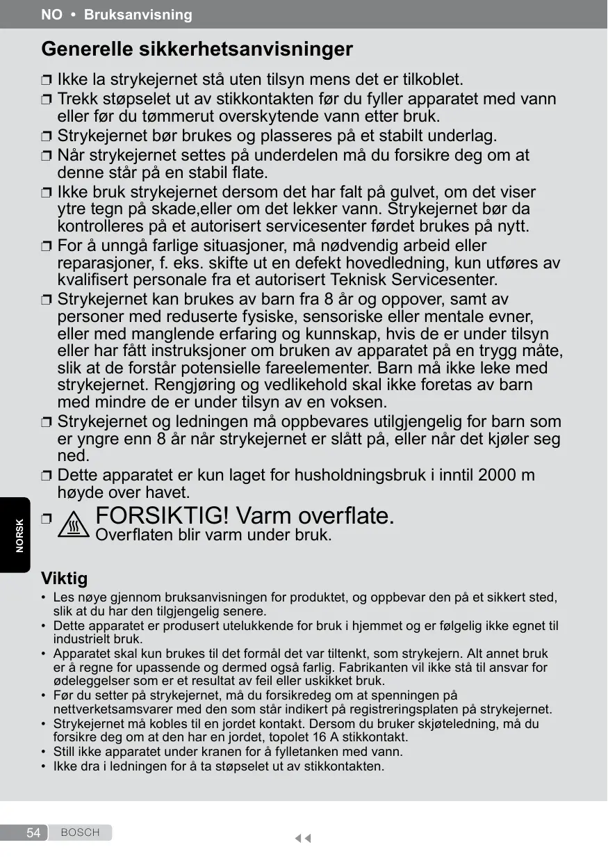 denne står på en stabil late. Ikke bruk strykejernet dersom det har falt på gulvet, om det viser ytre tegn på skade,eller om det lekker vann. Strykejernet bør da kontrolleres på et autorisert servicesenter førdet brukes på nytt. For å unngå farlige situasjoner, må nødvendig arbeid eller reparasjoner, f. eks. skifte ut en defekt hovedledning, kun utføres av kvaliisert personale fra et autorisert Teknisk Servicesenter. Strykejernet kan brukes av barn fra 8 år og oppover, samt av personer med reduserte fysiske, sensoriske eller mentale evner, eller med manglende erfaring og kunnskap, hvis de er under tilsyn eller har fått instruksjoner om bruken av apparatet på en trygg måte, slik at de forstår potensielle fareelementer. Barn må ikke leke med strykejernet. Rengjøring og vedlikehold skal ikke foretas av barn med mindre de er under tilsyn av en voksen. Strykejernet og ledningen må oppbevares utilgjengelig for barn som er yngre enn 8 år når strykejernet er slått på, eller når det kjøler seg ned. Dette apparatet er kun laget for husholdningsbruk i inntil 2000 m høyde over havet.