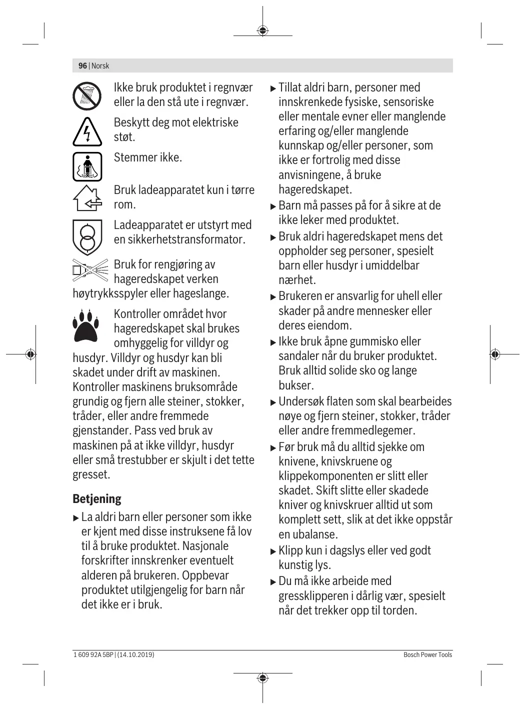 Ikke berør noen av delene på hageredskapet før de er helt stanset. Knivene fortsetter å rotere etter at hageredskapet er slått av og kan forårsake skader. 1 609 92A 5BP | (14.10.2019)