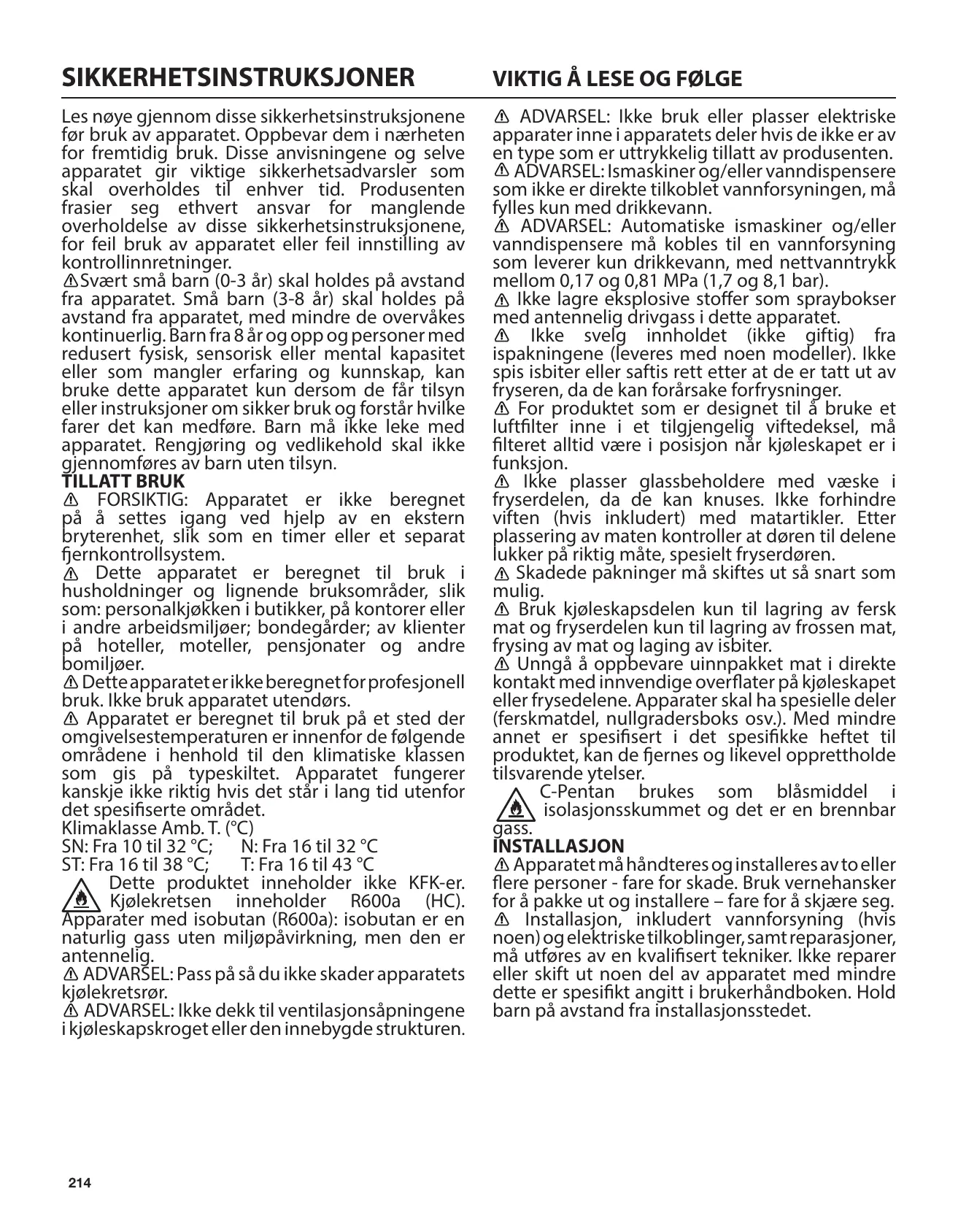 SN : De 10 à 32 °C; N : De 16 à 32 °C ST : De 16 à 38 °C; T : De 16 à 43 °C Cet appareil ne contient pas de CFC. Le circuit de ce réfrigérateur contient du R600a (HC).