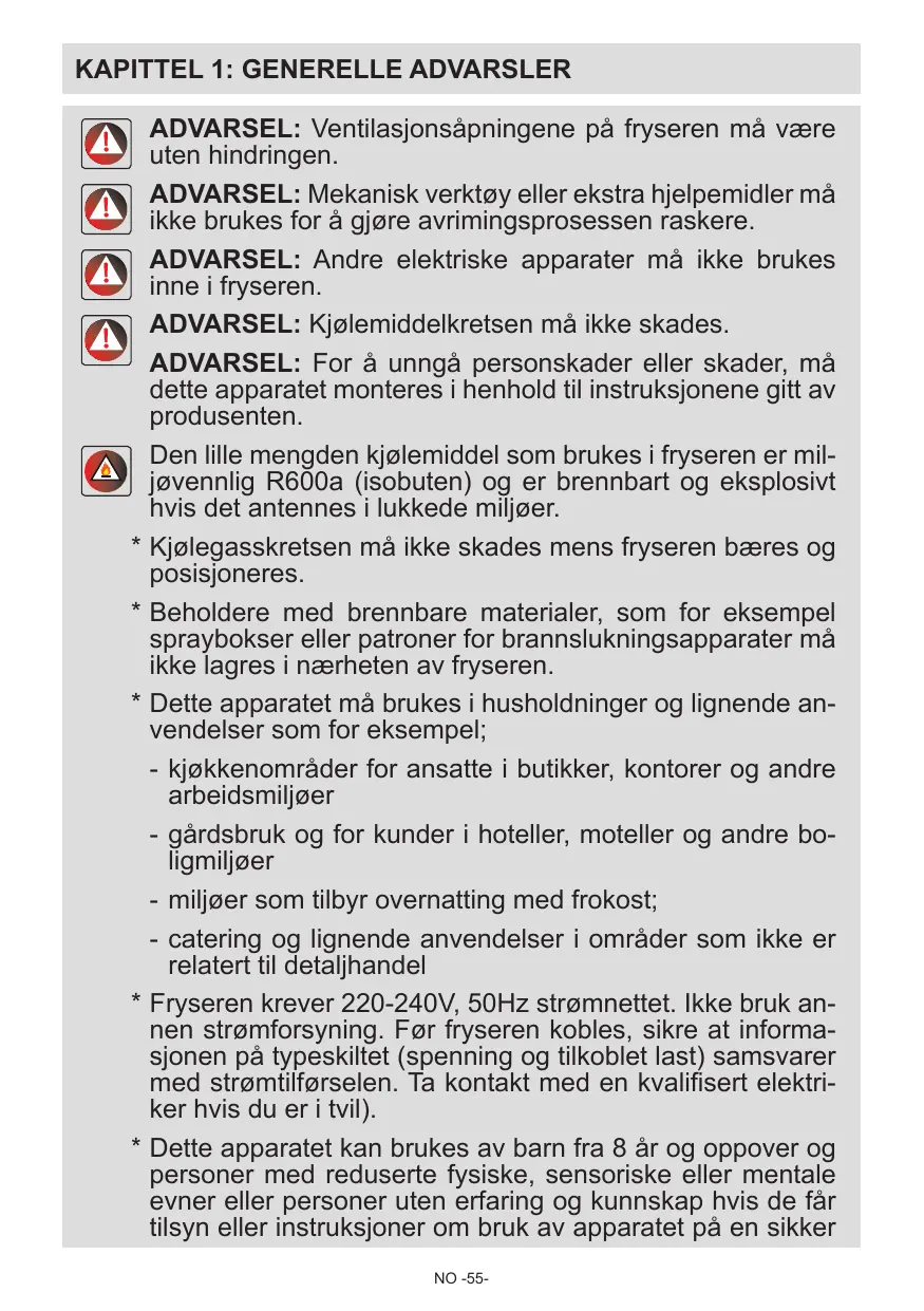 ADVARSEL: Ventilasjonsåpningene på fryseren må være uten hindringen. ADVARSEL: Mekanisk verktøy eller ekstra hjelpemidler må ikke brukes for å gjøre avrimingsprosessen raskere. ADVARSEL: Andre elektriske apparater må ikke brukes inne i fryseren. ADVARSEL: Kjølemiddelkretsen må ikke skades. ADVARSEL: For å unngå personskader eller skader, må dette apparatet monteres i henhold til instruksjonene gitt av produsenten. Den lille mengden kjølemiddel som brukes i fryseren er miljøvennlig R600a (isobuten) og er brennbart og eksplosivt hvis det antennes i lukkede miljøer. Kjølegasskretsen må ikke skades mens fryseren bæres og posisjoneres. Beholdere med brennbare materialer, som for eksempel spraybokser eller patroner for brannslukningsapparater må ikke lagres i nærheten av fryseren. Dette apparatet må brukes i husholdninger og lignende anvendelser som for eksempel; -- kjøkkenområder for ansatte i butikker, kontorer og andre arbeidsmiljøer -- gårdsbruk og for kunder i hoteller, moteller og andre boligmiljøer -- miljøer som tilbyr overnatting med frokost; -- catering og lignende anvendelser i områder som ikke er relatert til detaljhandel Fryseren krever 220-240V, 50Hz strømnettet. Ikke bruk annen strømforsyning. Før fryseren kobles, sikre at informasjonen på typeskiltet (spenning og tilkoblet last) samsvarer med strømtilførselen. Ta kontakt med en kvalifisert elektriker hvis du er i tvil). Dette apparatet kan brukes av barn fra 8 år og oppover og personer med reduserte fysiske, sensoriske eller mentale evner eller personer uten erfaring og kunnskap hvis de får tilsyn eller instruksjoner om bruk av apparatet på en sikker NO -55-
