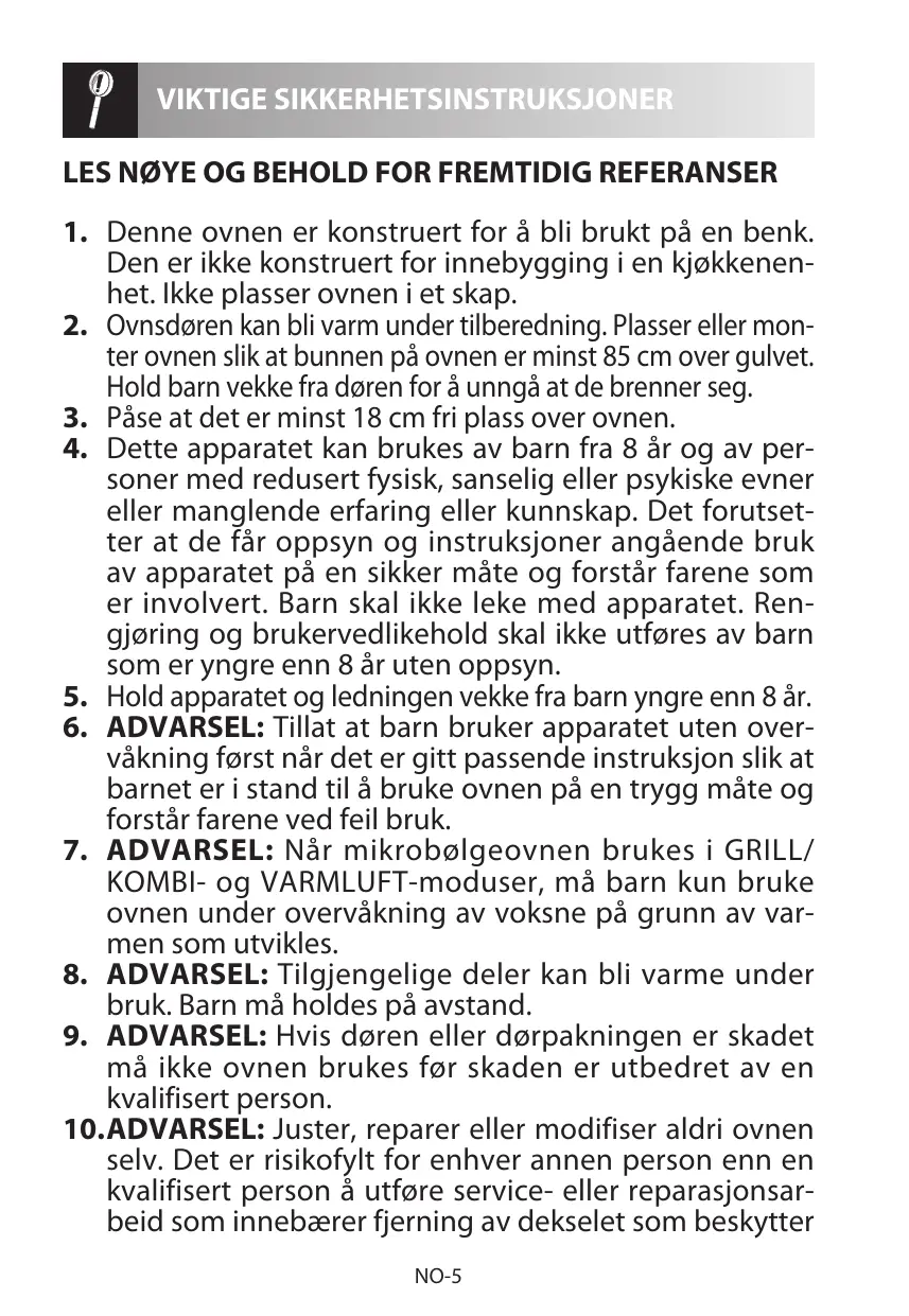 NORSK Indikator for TEMPERATUR Viser for VEKT VIKTIGE SIKKERHETSINSTRUKSJONER LES NØYE OG BEHOLD FOR FREMTIDIG REFERANSER 1. Denne ovnen er konstruert for å bli brukt på en benk. Den er ikke konstruert for innebygging i en kjøkkenenhet. Ikke plasser ovnen i et skap. 2. Ovnsdøren kan bli varm under tilberedning. Plasser eller monter ovnen slik at bunnen på ovnen er minst 85 cm over gulvet. Hold barn vekke fra døren for å unngå at de brenner seg. 3. Påse at det er minst 18 cm fri plass over ovnen. 4. Dette apparatet kan brukes av barn fra 8 år og av personer med redusert fysisk, sanselig eller psykiske evner eller manglende erfaring eller kunnskap. Det forutsetter at de får oppsyn og instruksjoner angående bruk av apparatet på en sikker måte og forstår farene som er involvert. Barn skal ikke leke med apparatet. Rengjøring og brukervedlikehold skal ikke utføres av barn som er yngre enn 8 år uten oppsyn. 5. Hold apparatet og ledningen vekke fra barn yngre enn 8 år. 6. ADVARSEL: Tillat at barn bruker apparatet uten overvåkning først når det er gitt passende instruksjon slik at barnet er i stand til å bruke ovnen på en trygg måte og forstår farene ved feil bruk. 7. ADVARSEL: Når mikrobølgeovnen brukes i GRILL/ KOMBI- og VARMLUFT-moduser, må barn kun bruke ovnen under overvåkning av voksne på grunn av varmen som utvikles. 8. ADVARSEL: Tilgjengelige deler kan bli varme under bruk. Barn må holdes på avstand. 9. ADVARSEL: Hvis døren eller dørpakningen er skadet må ikke ovnen brukes før skaden er utbedret av en kvalifisert person. 10. ADVARSEL: Juster, reparer eller modifiser aldri ovnen selv. Det er risikofylt for enhver annen person enn en kvalifisert person å utføre service- eller reparasjonsarbeid som innebærer fjerning av dekselet som beskytter NO-5