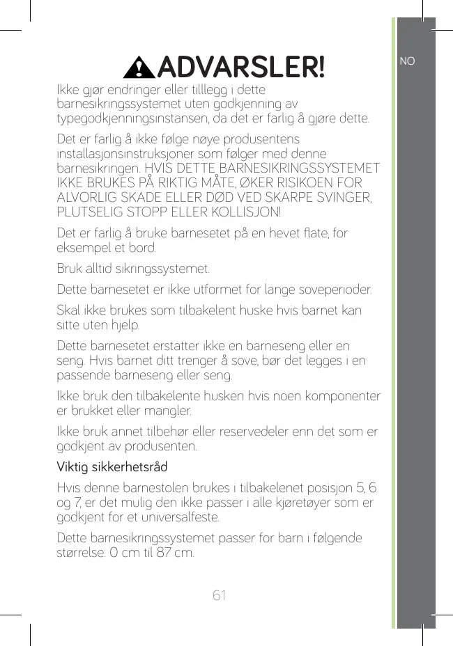 Ikke gjør endringer eller tilllegg i dette barnesikringssystemet uten godkjenning av typegodkjenningsinstansen, da det er farlig å gjøre dette. Det er farlig å ikke følge nøye produsentens installasjonsinstruksjoner som følger med denne barnesikringen. HVIS DETTE BARNESIKRINGSSYSTEMET IKKE BRUKES PÅ RIKTIG MÅTE, ØKER RISIKOEN FOR ALVORLIG SKADE ELLER DØD VED SKARPE SVINGER, PLUTSELIG STOPP ELLER KOLLISJON! Det er farlig å bruke barnesetet på en hevet flate, for eksempel et bord. Bruk alltid sikringssystemet. Dette barnesetet er ikke utformet for lange soveperioder. Skal ikke brukes som tilbakelent huske hvis barnet kan sitte uten hjelp. Dette barnesetet erstatter ikke en barneseng eller en seng. Hvis barnet ditt trenger å sove, bør det legges i en passende barneseng eller seng. Ikke bruk den tilbakelente husken hvis noen komponenter er brukket eller mangler. Ikke bruk annet tilbehør eller reservedeler enn det som er godkjent av produsenten. Viktig sikkerhetsråd Hvis denne barnestolen brukes i tilbakelenet posisjon 5, 6 og 7, er det mulig den ikke passer i alle kjøretøyer som er godkjent for et universalfeste. Dette barnesikringssystemet passer for barn i følgende størrelse: 0 cm til 87 cm. 61