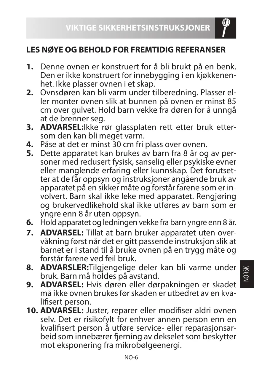- ADVARSEL: Tillat at barn bruker apparatet uten overvåkning Förstningar det er gitt passende instruksjon slick at barnet er i stand til á bruke ovnen på en trygg mæte og forstär farene ved feilBruk.