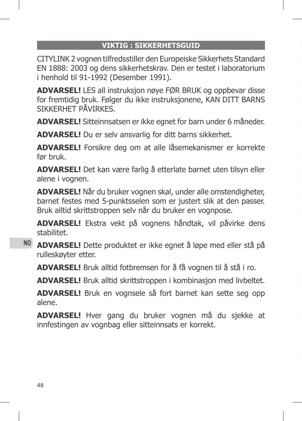 ADVARSEL! Når du bruker vognen skal, under alle omstendigheter, barnet festes med 5-punktsselen som er justert slik at den passer. Bruk alltid skrittstroppen selv når du bruker en vognpose. ADVARSEL! Ekstra vekt på vognens håndtak, vil påvirke dens stabilitet. NO ADVARSEL! Dette produktet er ikke egnet å løpe med eller stå på