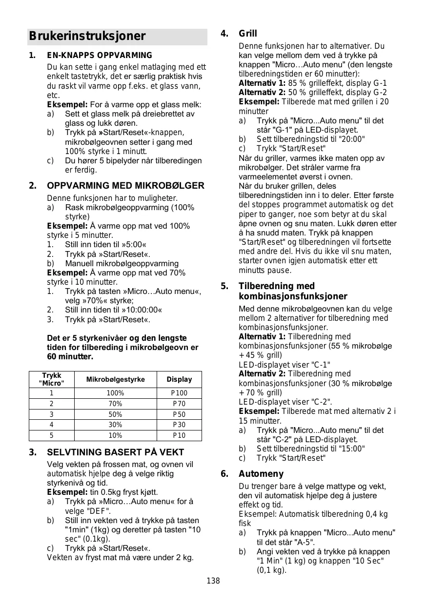 Denne funksjonen har to alternativer. Du kan velge mellom dem ved å trykke på knappen "Micro…Auto menu" (den lengste tilberedningstiden er 60 minutter): Alternativ 1: 85 % grilleffekt, display G-1 Alternativ 2: 50 % grilleffekt, display G-2 Eksempel: Tilberede mat med grillen i 20 minutter a) Trykk på "Micro...Auto menu" til det står "G-1" på LED-displayet. b) Sett tilberedningstid til "20:00" c) Trykk "Start/Reset" Når du griller, varmes ikke maten opp av mikrobølger. Det stråler varme fra varmeelementet øverst i ovnen. Når du bruker grillen, deles tilberedningstiden inn i to deler. Etter første del stoppes programmet automatisk og det piper to ganger, noe som betyr at du skal åpne ovnen og snu maten. Lukk døren etter å ha snudd maten. Trykk på knappen "Start/Reset" og tilberedningen vil fortsette med andre del. Hvis du ikke vil snu maten, starter ovnen igjen automatisk etter ett minutts pause. Denne funksjonen har to muligheter. a) Rask mikrobølgeoppvarming (100% styrke) Eksempel: Å varme opp mat ved 100% styrke i 5 minutter.
