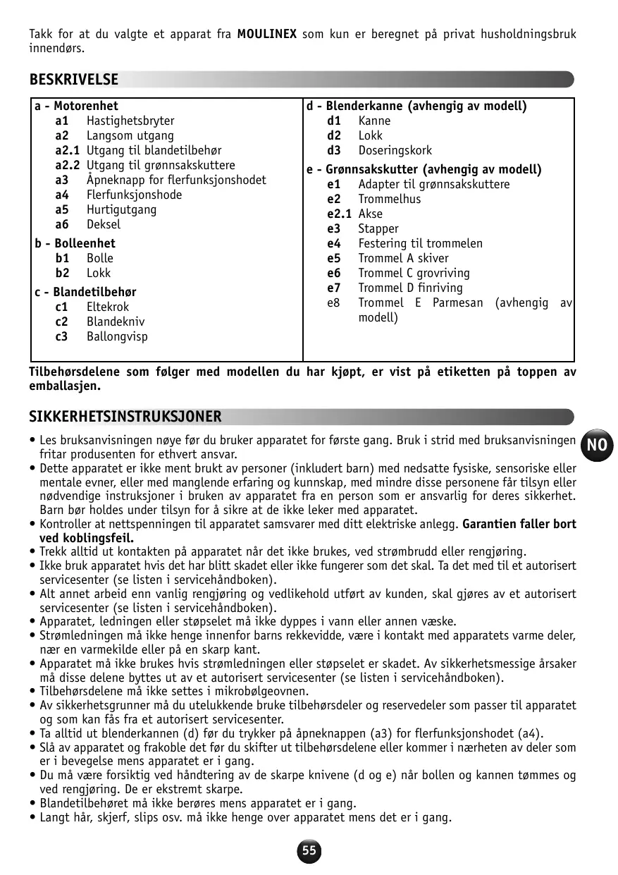 SIKKERHETSINSTRUKSJONER • Les bruksanvisningen nøye før du bruker apparatet for første gang. Bruk i strid med bruksanvisningen fritar produsenten for ethvert ansvar. • Dette apparatet er ikke ment brukt av personer (inkludert barn) med nedsatte fysiske, sensoriske eller mentale evner, eller med manglende erfaring og kunnskap, med mindre disse personene får tilsyn eller nødvendige instruksjoner i bruken av apparatet fra en person som er ansvarlig for deres sikkerhet. Barn bør holdes under tilsyn for å sikre at de ikke leker med apparatet. • Kontroller at nettspenningen til apparatet samsvarer med ditt elektriske anlegg. Garantien faller bort ved koblingsfeil. • Trekk alltid ut kontakten på apparatet når det ikke brukes, ved strømbrudd eller rengjøring. • Ikke bruk apparatet hvis det har blitt skadet eller ikke fungerer som det skal. Ta det med til et autorisert servicesenter (se listen i servicehåndboken). • Alt annet arbeid enn vanlig rengjøring og vedlikehold utført av kunden, skal gjøres av et autorisert servicesenter (se listen i servicehåndboken). • Apparatet, ledningen eller støpselet må ikke dyppes i vann eller annen væske. • Strømledningen må ikke henge innenfor barns rekkevidde, være i kontakt med apparatets varme deler, nær en varmekilde eller på en skarp kant. • Apparatet må ikke brukes hvis strømledningen eller støpselet er skadet. Av sikkerhetsmessige årsaker må disse delene byttes ut av et autorisert servicesenter (se listen i servicehåndboken). • Tilbehørsdelene må ikke settes i mikrobølgeovnen. • Av sikkerhetsgrunner må du utelukkende bruke tilbehørsdeler og reservedeler som passer til apparatet og som kan fås fra et autorisert servicesenter. • Ta alltid ut blenderkannen (d) før du trykker på åpneknappen (a3) for flerfunksjonshodet (a4). • Slå av apparatet og frakoble det før du skifter ut tilbehørsdelene eller kommer i nærheten av deler som er i bevegelse mens apparatet er i gang. • Du må være forsiktig ved håndtering av de skarpe knivene (d og e) når bollen og kannen tømmes og ved rengjøring. De er ekstremt skarpe. • Blandetilbehøret må ikke berøres mens apparatet er i gang. • Langt hår, skjerf, slips osv. må ikke henge over apparatet mens det er i gang. 55