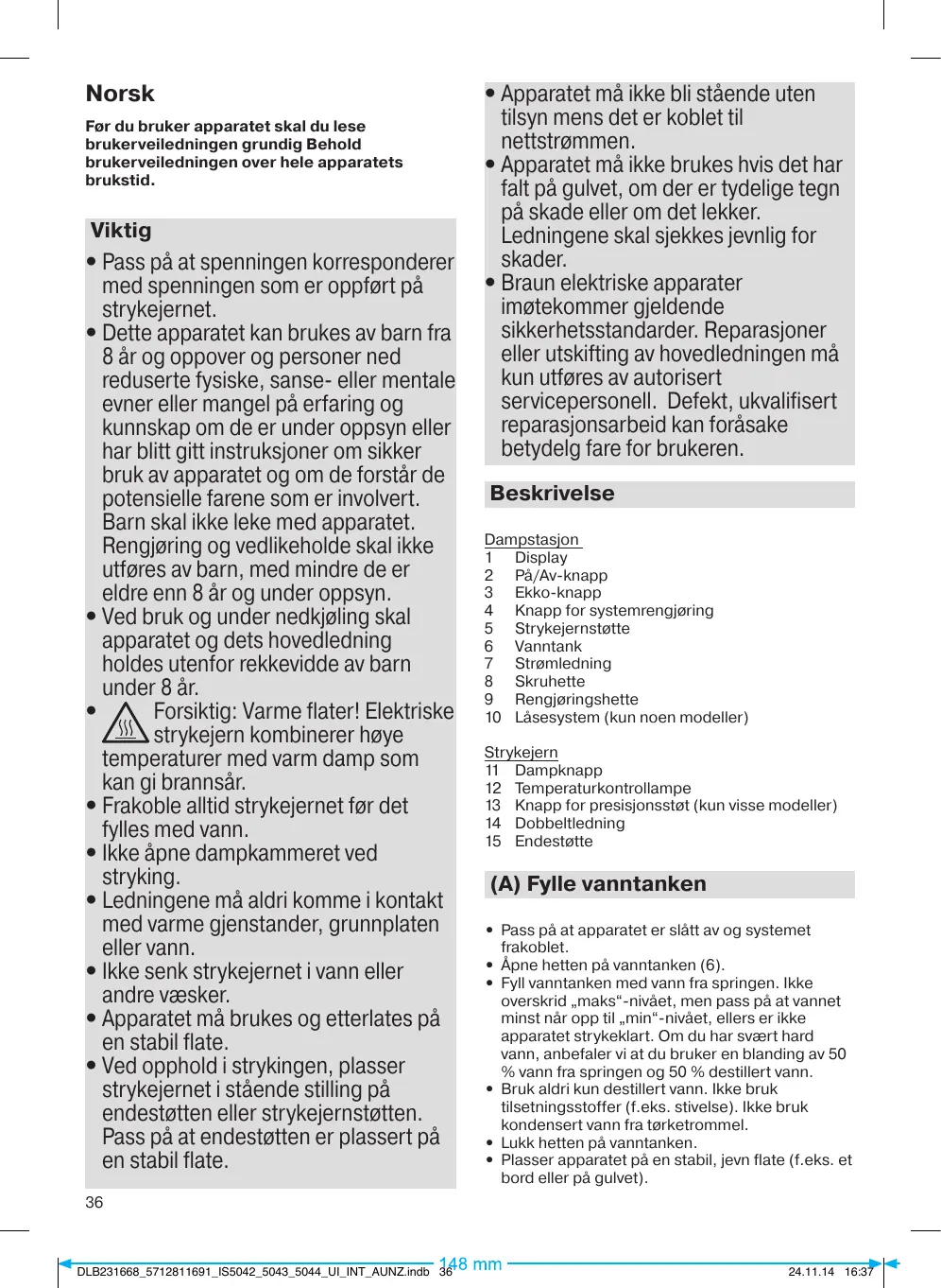 ‹‹Los electrodomésticos Braun cumplen todos los estándares de seguridad aplicables. De la reparación o sustitución del cable de red únicamente debe encargarse personal de servicio técnico autorizado. Un trabajo de reparación inadecuado y no profesional puede resultar en un considerable peligro para el usuario. Descripción Centro de planchado al vapor 1 Pantalla 2 Botón de encendido/apagado 6 Depósito de agua 7 Cable de alimentación 8 Tapón roscado 9 Tapón de limpieza 10 Sistema de bloqueo (solo en algunos modelos) Plancha 11 Botón de vapor 12 Luz de control de temperatura 13 Botón de golpe con precisión (solo en algunos modelos) 14 Cable doble 15 Parte trasera de apoyo