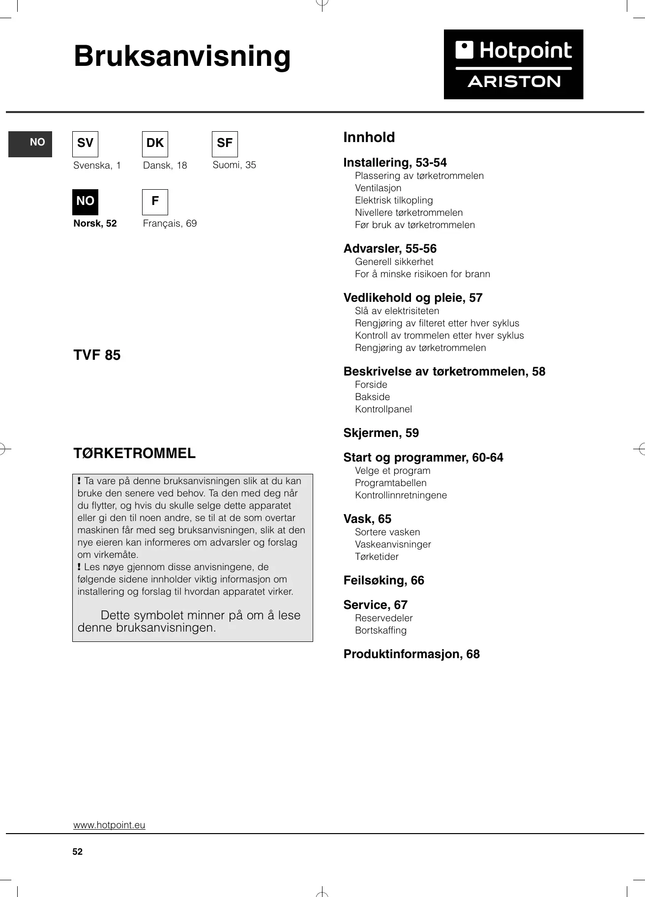 BRUKSANVISNING FTVF85CPSK HOTPOINT