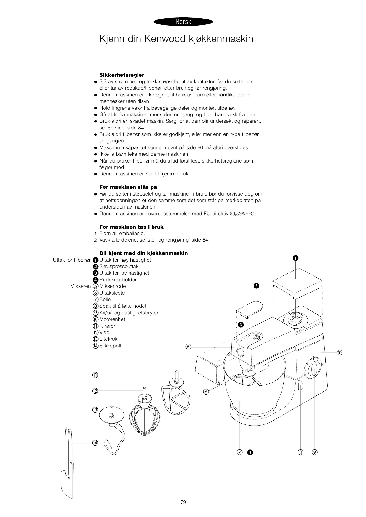 Sikkerhetsregler Slå av strømmen og trekk støpselet ut av kontakten før du setter på eller tar av redskap/tilbehør, etter bruk og før rengjøring. Denne maskinen er ikke egnet til bruk av barn eller handikappede mennesker uten tilsyn. Hold fingrene vekk fra bevegelige deler og montert tilbehør. Gå aldri fra maksinen mens den er igang, og hold barn vekk fra den. Bruk aldri en skadet maskin. Sørg for at den blir undersøkt og reparert, se ‘Service’ side 84. Bruk aldri tilbehør som ikke er godkjent, eller mer enn en type tilbehør av gangen . Maksimum kapasitet som er nevnt på side 80 må aldri overstiges. Ikke la barn leke med denne maskinen. Når du bruker tilbehør må du alltid først lese sikkerhetsreglene som følger med. Denne maskinen er kun til hjemmebruk. Før maskinen slås på Før du setter i støpselet og tar maskinen i bruk, bør du forvisse deg om at nettspenningen er den samme som det som står på merkeplaten på undersiden av maskinen. Denne maskinen er i overensstemmelse med EU-direktiv 89/336/EEC. Før maskinen tas i bruk