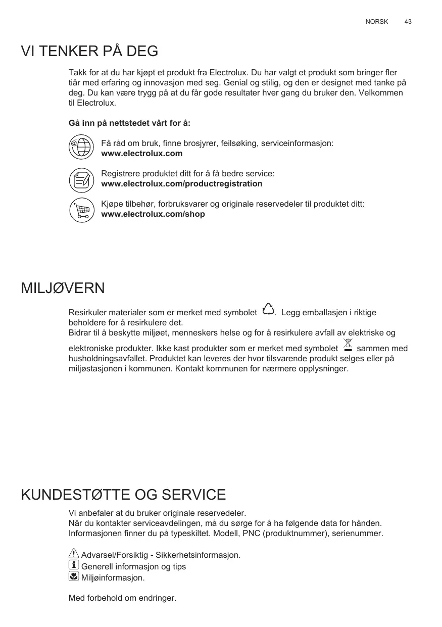 Vi anbefaler at du bruker originale reservedeler. Når du kontakter serviceavdelingen, må du sørge for å ha følgende data for hånden. Informasjonen finner du på typeskiltet. Modell, PNC (produktnummer), serienummer. Advarsel/Forsiktig - Sikkerhetsinformasjon. Generell informasjon og tips Miljøinformasjon. Med forbehold om endringer.