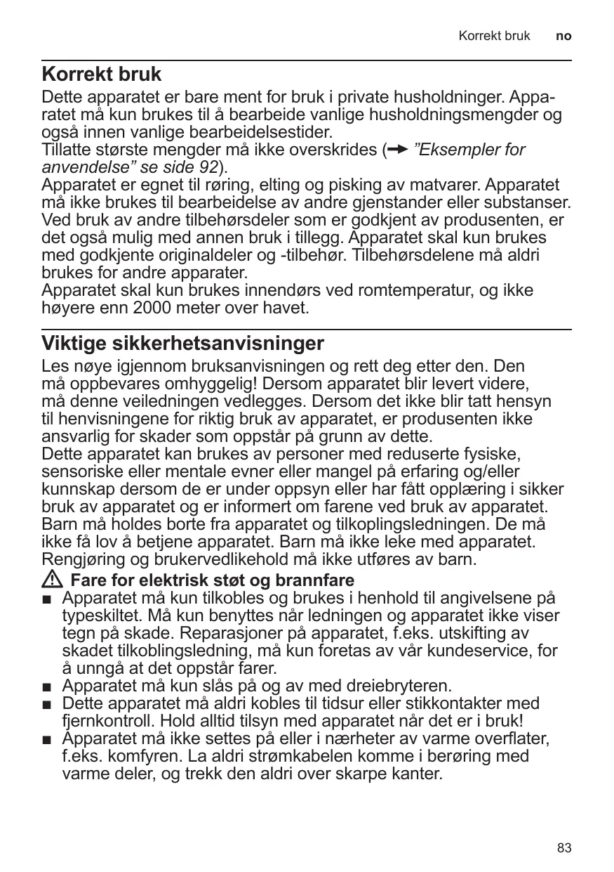 Korrekt bruk Dette apparatet er bare ment for bruk i private husholdninger. Appa ratet må kun brukes til å bearbeide vanlige husholdningsmengder og også innen vanlige bearbeidelsestider. Tillatte største mengder må ikke overskrides (X ”Eksempler for anvendelse” se side 92). Apparatet er egnet til røring, elting og pisking av matvarer. Apparatet må ikke brukes til bearbeidelse av andre gjenstander eller substanser. Ved bruk av andre tilbehørsdeler som er godkjent av produsenten, er det også mulig med annen bruk i tillegg. Apparatet skal kun brukes med godkjente originaldeler og -tilbehør. Tilbehørsdelene må aldri brukes for andre apparater. Apparatet skal kun brukes innendørs ved romtemperatur, og ikke høyere enn 2000 meter over havet. Viktige sikkerhetsanvisninger Les nøye igjennom bruksanvisningen og rett deg etter den. Den må oppbevares omhyggelig! Dersom apparatet blir levert videre, må denne veiledningen vedlegges. Dersom det ikke blir tatt hensyn til henvisningene for riktig bruk av apparatet, er produsenten ikke ansvarlig for skader som oppstår på grunn av dette. Dette apparatet kan brukes av personer med reduserte fysiske, sensoriske eller mentale evner eller mangel på erfaring og/eller kunnskap dersom de er under oppsyn eller har fått opplæring i sikker bruk av apparatet og er informert om farene ved bruk av apparatet. Barn må holdes borte fra apparatet og tilkoplingsledningen. De må ikke få lov å betjene apparatet. Barn må ikke leke med apparatet. Rengjøring og brukervedlikehold må ikke utføres av barn. WW Fare for elektrisk støt og brannfare ■■ Apparatet må kun tilkobles og brukes i henhold til angivelsene på typeskiltet. Må kun benyttes når ledningen og apparatet ikke viser tegn på skade. Reparasjoner på apparatet, f.eks. utskifting av skadet tilkoblingsledning, må kun foretas av vår kundeservice, for å unngå at det oppstår farer. ■■ Apparatet må kun slås på og av med dreiebryteren. ■■ Dette apparatet må aldri kobles til tidsur eller stikkontakter med fjernkontroll. Hold alltid tilsyn med apparatet når det er i bruk! ■■ Apparatet må ikke settes på eller i nærheter av varme overflater, f.eks. komfyren. La aldri strømkabelen komme i berøring med varme deler, og trekk den aldri over skarpe kanter.
