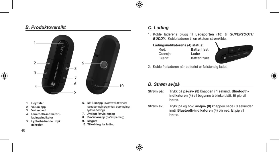Last ned instruksjonene for din Bluetooth lydtilbehør i PDF-format gratis! Finn veiledningen din BUDDY - SUPERTOOTH og ta den elektroniske enheten tilbake i hendene. På denne siden er alle dokumenter som er nødvendige for bruken av enheten din publisert. BUDDY av merket SUPERTOOTH.