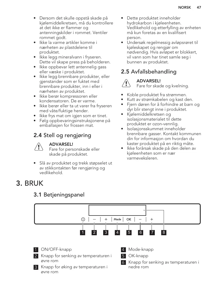 2.5 Avfallsbehandling ADVARSEL! Fare for skade og kvelning. • Koble produktet fra strømmen. • Kutt av strømkabelen og kast den. • Fjern døren for å forhindre at barn og dyr blir stengt inne i produktet. • Kjølemiddelkretsen og isolasjonsmaterialet til dette produktet er ozon-vennlig. • Isolasjonsskummet inneholder brennbare gasser. Kontakt kommunen din for informasjon om hvordan du kaster produktet på en riktig måte. • Ikke forårsak skade på den delen av kjøleenheten som er nær varmeveksleren.