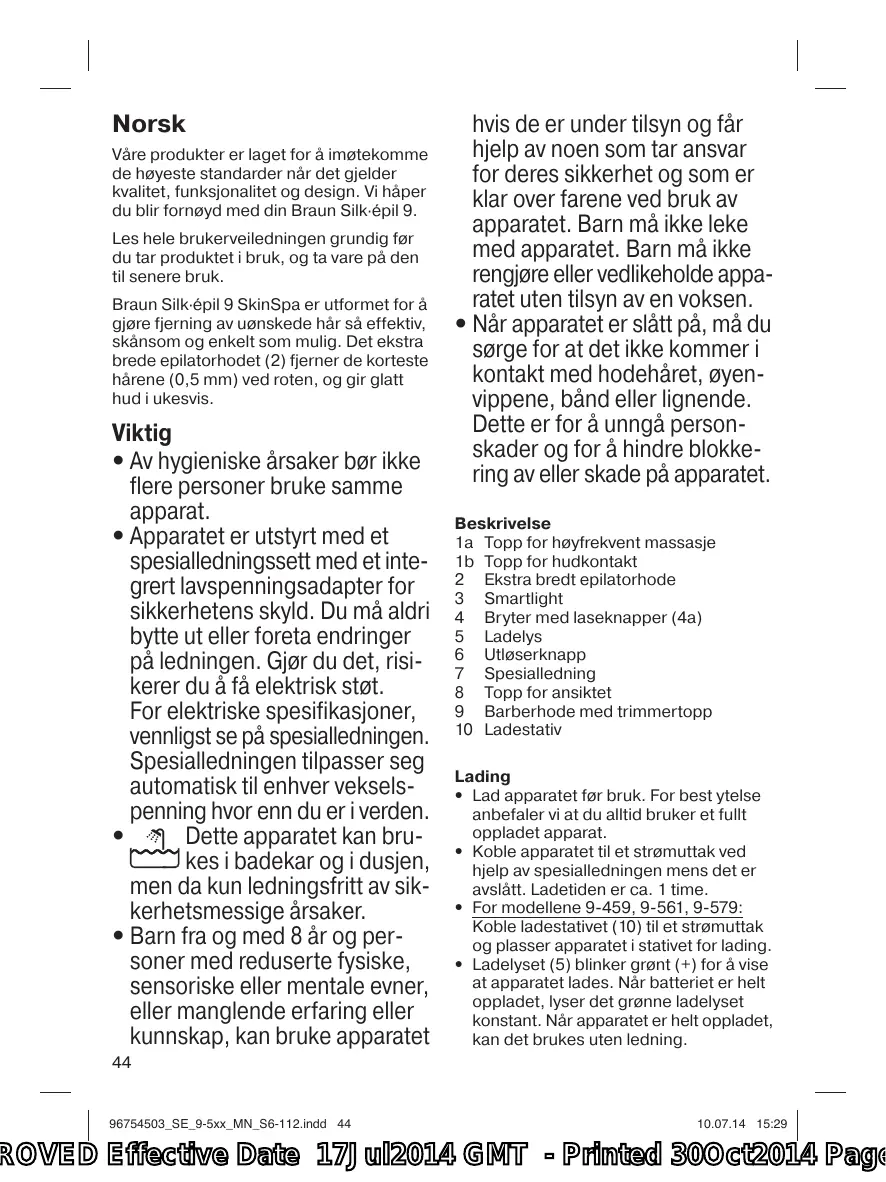 hvis de er under tilsyn og får hjelp av noen som tar ansvar for deres sikkerhet og som er klar over farene ved bruk av apparatet. Barn må ikke leke med apparatet. Barn må ikke rengjøre eller vedlikeholde apparatet uten tilsyn av en voksen. • Når apparatet er slått på, må du sørge for at det ikke kommer i kontakt med hodehåret, øyenvippene, bånd eller lignende. Dette er for å unngå personskader og for å hindre blokkering av eller skade på apparatet. Beskrivelse 1a Topp for høyfrekvent massasje 1b Topp for hudkontakt 2 Ekstra bredt epilatorhode 3 Smartlight 4 Bryter med laseknapper (4a) 5 Ladelys 6 Utløserknapp 7 Spesialledning 8 Topp for ansiktet 9 Barberhode med trimmertopp 10 Ladestativ Lading • Lad apparatet før bruk. For best ytelse anbefaler vi at du alltid bruker et fullt oppladet apparat. • Koble apparatet til et strømuttak ved hjelp av spesialledningen mens det er avslått. Ladetiden er ca. 1 time. • For modellene 9-459, 9-561, 9-579: Koble ladestativet (10) til et strømuttak og plasser apparatet i stativet for lading. • Ladelyset (5) blinker grønt (+) for å vise at apparatet lades. Når batteriet er helt oppladet, lyser det grønne ladelyset konstant. Når apparatet er helt oppladet, kan det brukes uten ledning.