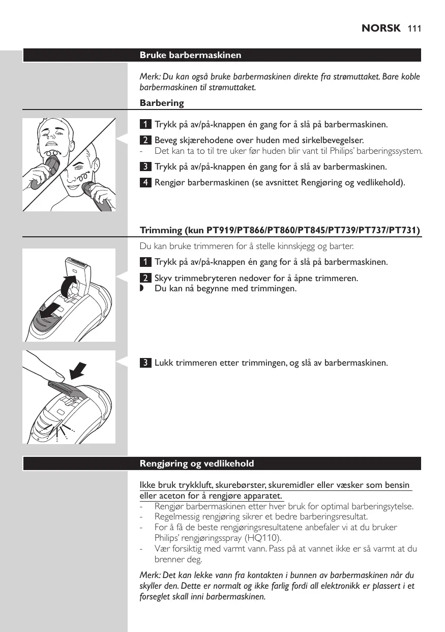 NORSK Anvisninger for lading Lav batterikapasitet -- Når batteriet nesten er tomt for strøm (når det bare er fem eller færre minutter igjen), begynner ladelampen å blinke oransje. -- Når du slår av barbermaskinen, fortsetter ladelampen å blinke oransje i noen sekunder. Hurtiglading -- Når du begynner å lade et tomt batteri, blinker ladelampen vekselvis oransje og grønt. Etter ca. tre minutter fortsetter ladelampen å blinke grønt. Da har barbermaskinen nok strøm til en fem minutters barbering. Lading -- Når apparatet lades, blinker ladelampen grønt. Fulladet batteri -- Når batteriet er fulladet, lyser ladelampen kontinuerlig grønt. Merk: Ladelampen slukkes etter ca. 30 minutter for å spare energi. Lade med adapteren 1 Koble den lille kontakten til barbermaskinen. 2 Sett adapteren i stikkontakten. ,, Ladelampen viser ladestatusen til barbermaskinen (se avsnittet Ladeindikasjoner i dette kapittelet). Lade i ladestativet (kun PT866/PT739) 1 Koble den lille kontakten til ladestativet. 2 Sett adapteren i stikkontakten. 3 Sett barbermaskinen i ladestativet. ,, Ladelampen viser ladestatusen til barbermaskinen (se avsnittet Ladeindikasjoner i dette kapittelet). NORSK 111 Bruke barbermaskinen Merk: Du kan også bruke barbermaskinen direkte fra strømuttaket. Bare koble barbermaskinen til strømuttaket. Barbering 1 Trykk på av/på-knappen én gang for å slå på barbermaskinen. 2 Beveg skjærehodene over huden med sirkelbevegelser. -- Det kan ta to til tre uker før huden blir vant til Philips’ barberingssystem. 3 Trykk på av/på-knappen én gang for å slå av barbermaskinen. 4 Rengjør barbermaskinen (se avsnittet Rengjøring og vedlikehold). Trimming (kun PT919/PT866/PT860/PT845/PT739/PT737/PT731) Du kan bruke trimmeren for å stelle kinnskjegg og barter. 1 Trykk på av/på-knappen én gang for å slå på barbermaskinen. 2 Skyv trimmebryteren nedover for å åpne trimmeren. ,, Du kan nå begynne med trimmingen. 3 Lukk trimmeren etter trimmingen, og slå av barbermaskinen. Rengjøring og vedlikehold Ikke bruk trykkluft, skurebørster, skuremidler eller væsker som bensin eller aceton for å rengjøre apparatet. -- Rengjør barbermaskinen etter hver bruk for optimal barberingsytelse. -- Regelmessig rengjøring sikrer et bedre barberingsresultat. -- For å få de beste rengjøringsresultatene anbefaler vi at du bruker Philips’ rengjøringsspray (HQ110). -- Vær forsiktig med varmt vann. Pass på at vannet ikke er så varmt at du brenner deg. Merk: Det kan lekke vann fra kontakten i bunnen av barbermaskinen når du skyller den. Dette er normalt og ikke farlig fordi all elektronikk er plassert i et forseglet skall inni barbermaskinen.