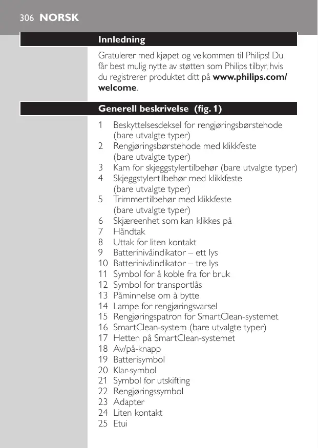 Merk: Tilbehoret som følger med kan variere for forskjelligeprodukter. Du kan se hva slags tilbehør som følger med apparatet, pa esken.