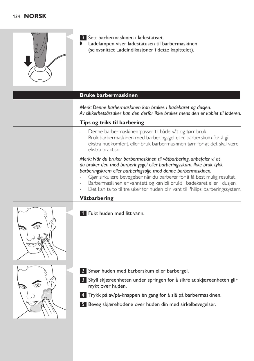NORSK 3 Sett barbermaskinen i ladestativet. ,, Ladelampen viser ladestatusen til barbermaskinen (se avsnittet Ladeindikasjoner i dette kapittelet). Bruke barbermaskinen Merk: Denne barbermaskinen kan brukes i badekaret og dusjen. Av sikkerhetsårsaker kan den derfor ikke brukes mens den er koblet til laderen. Tips og triks til barbering -- Denne barbermaskinen passer til både våt og tørr bruk. Bruk barbermaskinen med barberingsgel eller barberskum for å gi ekstra hudkomfort, eller bruk barbermaskinen tørr for at det skal være ekstra praktisk. Merk: Når du bruker barbermaskinen til våtbarbering, anbefaler vi at du bruker den med barberingsgel eller barberingsskum. Ikke bruk tykk barberingskrem eller barberingsolje med denne barbermaskinen. -- Gjør sirkulære bevegelser når du barberer for å få best mulig resultat. -- Barbermaskinen er vanntett og kan bli brukt i badekaret eller i dusjen. -- Det kan ta to til tre uker før huden blir vant til Philips’ barberingssystem. Våtbarbering 1 Fukt huden med litt vann. 2 Smør huden med barberskum eller barbergel. 3 Skyll skjæreenheten under springen for å sikre at skjæreenheten glir mykt over huden. 4 Trykk på av/på-knappen én gang for å slå på barbermaskinen. 5 Beveg skjærehodene over huden din med sirkelbevegelser. NORSK 135 Merk: Skyll barbermaskinen under springen regelmessig for å sikre at den fortsetter å gli mykt over huden. 6 Trykk én gang på av/på-knappen for å slå av barbermaskinen, og tørk ansiktet. 7 Rengjør barbermaskinen (se avsnittet Rengjøring og vedlikehold). Merk: Sørg for at du skyller all skum og barbergel av barbermaskinen. Tørrbarbering 1 Trykk på av/på-knappen én gang for å slå på barbermaskinen. 2 Beveg skjærehodene over huden din med sirkelbevegelser. 3 Trykk på av/på-knappen én gang etter barbering for å slå av barbermaskinen. 4 Rengjør barbermaskinen (se avsnittet Rengjøring og vedlikehold). Trimme (kun AT941/AT940/AT918/AT897/AT896/AT894/AT891/ AT890/AT889/AT887/AT886/AT872/AT811/AT797/AT796/ AT790/AT756) Du kan bruke trimmeren for å stelle kinnskjegg og barter. 1 Skyv trimmebryteren nedover for å åpne trimmeren. 2 Trykk på av/på-knappen én gang for å slå på barbermaskinen. ,, Du kan nå begynne med trimmingen. 3 Trykk på av/på-knappen én gang etter trimming for å slå av barbermaskinen. 4 Rengjøre barbermaskinen (se kapittelet Rengjøring og vedlikehold).