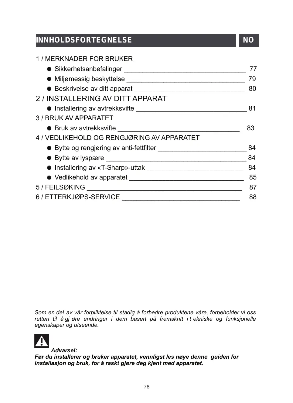 2 / INSTALLERING AV DITT APPARAT Installering av avtrekksvifte ______________________________ 81 3 / BRUK AV APPARATET Bruk av avtrekksvifte _________________________________ 83 4 / VEDLIKEHOLD OG RENGJØRING AV APPARATET Bytte og rengjøring av anti-fettfilter ________________________ 84 Bytte av lyspære ______________________________________ 84 Installering av «T-Sharp»-uttak __________________________ 84 Vedlikehold av apparatet _______________________________ 85 5 / FEILSØKING __________________________________________ 87 6 / ETTERKJØPS-SERVICE ________________________________ 88