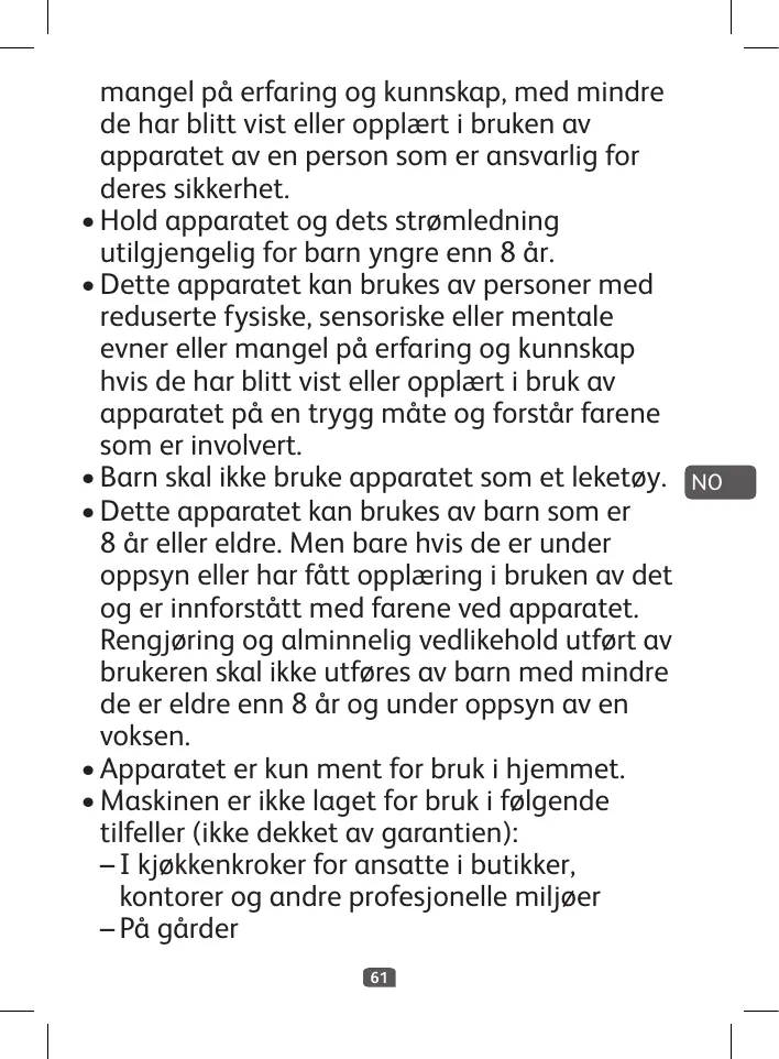 • Les enfants ne doivent pas utiliser l’appareil comme un jouet. • Cet appareil peut être utilisé par des enfants âgés d’au moins 8 ans, à condition qu’ils bénéficient d’une surveillance ou qu’ils aient reçu des instructions quant à l’utilisation de l’appareil en toute sécurité et qu’ils comprennent bien les dangers encourus. Le nettoyage et l’entretien par l’utilisateur ne doivent pas être effectués par des enfants, à moins qu’ils ne soient âgés de plus de 8 ans et qu’ils soient sous la surveillance d’un adulte. • Votre machine a été conçue pour un usage domestique seulement. • Votre machine n’a pas été conçue pour être utilisée dans les cas suivants qui ne sont pas couverts par la garantie : ––dans des coins de cuisines réservés au personnel dans des magasins, bureaux et autres environnements professionnels, ––dans des fermes, ––par les clients des hôtels, motels et autres environnements à caractère résidentiel, ––dans des environnements de type chambres d’hôtes. 2