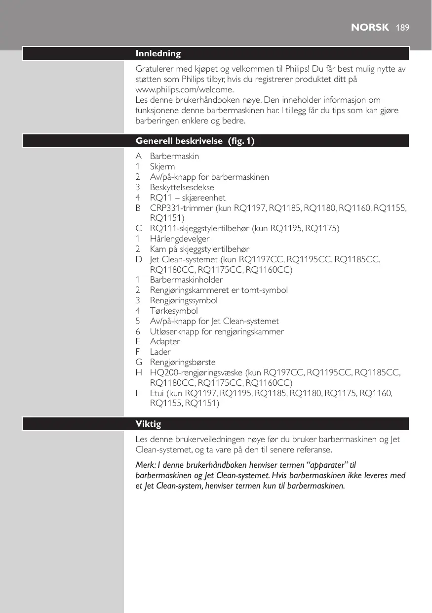 E F G H I Barbermaskin Skjerm Av/på-knapp for barbermaskinen Beskyttelsesdeksel RQ11 – skjæreenhet CRP331-trimmer (kun RQ1197, RQ1185, RQ1180, RQ1160, RQ1155, RQ1151) RQ111-skjeggstylertilbehør (kun RQ1195, RQ1175) Hårlengdevelger Kam på skjeggstylertilbehør Jet Clean-systemet (kun RQ1197CC, RQ1195CC, RQ1185CC, RQ1180CC, RQ1175CC, RQ1160CC) Barbermaskinholder Rengjøringskammeret er tomt-symbol Rengjøringssymbol Tørkesymbol Av/på-knapp for Jet Clean-systemet Utløserknapp for rengjøringskammer Adapter Lader Rengjøringsbørste HQ200-rengjøringsvæske (kun RQ197CC, RQ1195CC, RQ1185CC, RQ1180CC, RQ1175CC, RQ1160CC) Etui (kun RQ1197, RQ1195, RQ1185, RQ1180, RQ1175, RQ1160, RQ1155, RQ1151)
