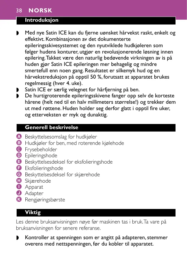 Beskyttelsesomslag for hudkjøler Hudkjøler for ben, med roterende kjølehode Frysebeholder Epileringshode Beskyttelsesdeksel for eksfolieringshode Eksfolieringshode Beskyttelsesdeksel for skjærehode Skjærehode Apparat Adapter Rengjøringsbørste Viktig Les denne bruksanvisningen nøye før maskinen tas i bruk.Ta vare på bruksanvisningen for senere referanse.
