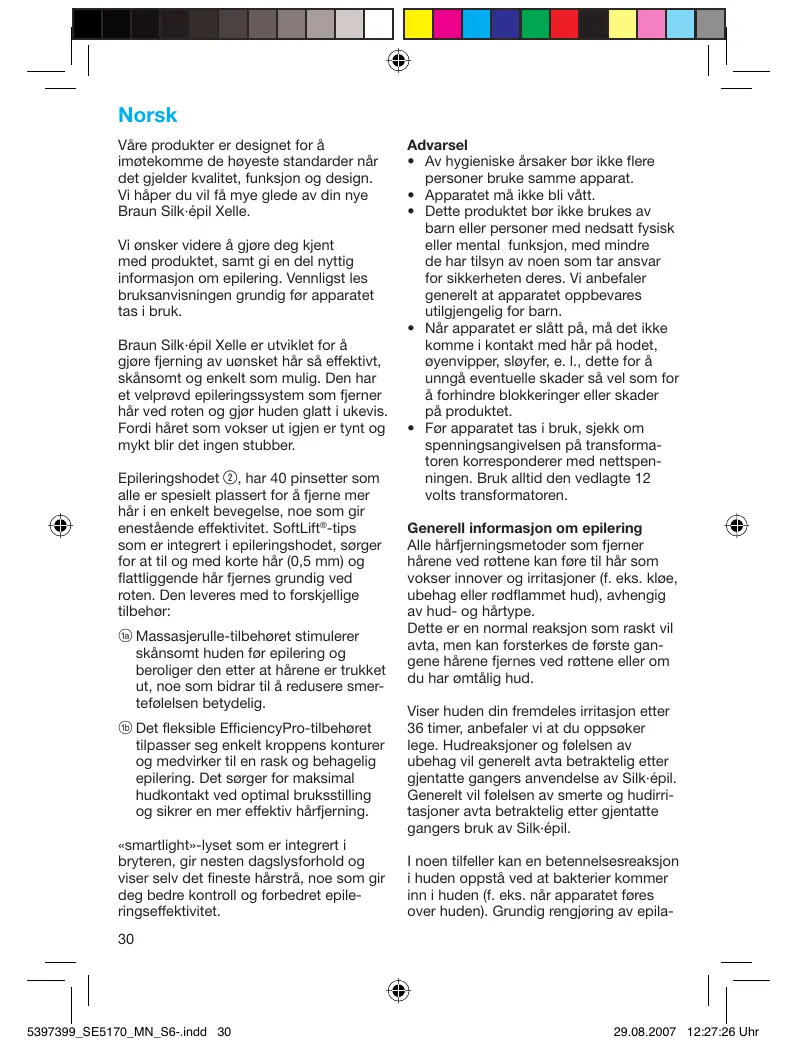 • Før apparatet tas i bruk, sjekk om spenningsangivelsen på transformatoren korresponderer med nettspenningen. Bruk alltid den vedlagte 12 volts transformatoren. Generell informasjon om epilering Alle hårfjerningsmetoder som fjerner hårene ved røttene kan føre til hår som vokser innover og irritasjoner (f. eks. kløe, ubehag eller rødflammet hud), avhengig av hud- og hårtype. Dette er en normal reaksjon som raskt vil avta, men kan forsterkes de første gangene hårene fjernes ved røttene eller om du har ømtålig hud. Viser huden din fremdeles irritasjon etter 36 timer, anbefaler vi at du oppsøker lege. Hudreaksjoner og følelsen av ubehag vil generelt avta betraktelig etter gjentatte gangers anvendelse av Silk·épil. Generelt vil følelsen av smerte og hudirritasjoner avta betraktelig etter gjentatte gangers bruk av Silk·épil. I noen tilfeller kan en betennelsesreaksjon i huden oppstå ved at bakterier kommer inn i huden (f. eks. når apparatet føres over huden). Grundig rengjøring av epila-