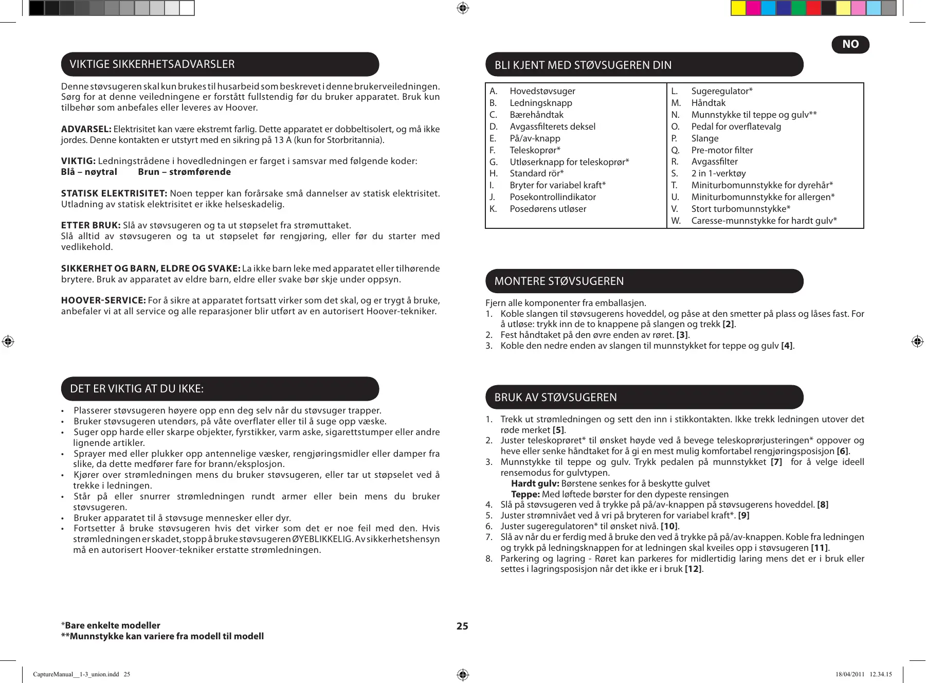 Plasserer støvsugeren høyere opp enn deg selv når du støvsuger trapper. Bruker støvsugeren utendørs, på våte overflater eller til å suge opp væske. Suger opp harde eller skarpe objekter, fyrstikker, varm aske, sigarettstumper eller andre lignende artikler. Sprayer med eller plukker opp antennelige væsker, rengjøringsmidler eller damper fra slike, da dette medfører fare for brann/eksplosjon. Kjører over strømledningen mens du bruker støvsugeren, eller tar ut støpselet ved å trekke i ledningen. Står på eller snurrer strømledningen rundt armer eller bein mens du bruker støvsugeren. Bruker apparatet til å støvsuge mennesker eller dyr. Fortsetter å bruke støvsugeren hvis det virker som det er noe feil med den. Hvis strømledningen er skadet, stopp å bruke støvsugeren ØYEBLIKKELIG. Av sikkerhetshensyn må en autorisert Hoover-tekniker erstatte strømledningen. *Bare enkelte modeller **Munnstykke kan variere fra modell til modell CaptureManual__1-3_union.indd 25 Sugeregulator* Håndtak Munnstykke til teppe og gulv** Pedal for overflatevalg Slange Pre-motor filter Avgassfilter 2 in 1-verktøy Miniturbomunnstykke for dyrehår* Miniturbomunnstykke for allergen* Stort turbomunnstykke* Caresse-munnstykke for hardt gulv*