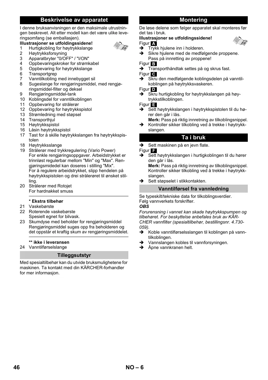 EN 60335–2–79 EN 61000–3–2: 2006+A1: 2009+A2: 2009 EN 61000–3–3: 2013 EN 62233: 2008 Procedimiento de evaluación de la conformidad aplicado 2000/14/CE: Anexo V Nivel de potencia acústica dB(A) Medido: 87 Garantizado: à rede 5 Local de armazenamento para mangueira de alta pressão 6 Alça de transporte 7 Conexão de água com peneira incorporada 8 Mangueira de aspiração do detergente com filtro de detergente e tampa 9 Reservatório de detergente 10 Peça de acoplamento para ligação da água 11 Local de armazenamento para lança 12 Local de armazenamento da pistola pulverizadora manual 13 Cabo de ligação à rede com ficha de rede 14 Roda de transporte 15 Pistola de injecção manual 16 Bloqueio da pistola pulverizadora manual 17 Botão para separar a mangueira de alta pressão da pistola pulverizadora manual 18 Mangueira de alta pressão EN 60335–1 EN 60335–2–79 EN 61000–3–2: 2006+A1: 2009+A2: 2009 EN 61000–3–3: 2013 EN 62233: 2008 Processo aplicado de avaliação de conformidade 2000/14/CE: Anexo V Nível de potência acústica dB(A) Medido: 87 EN 60335–1 EN 60335–2–79 EN 61000–3–2: 2006+A1: 2009+A2: 2009 EN 61000–3–3: 2013 EN 62233: 2008 Anvendte overensstemmelsesvurderingsprocedurer 2000/14/EF: Bilag V Lydeffektniveau dB(A) Målt: EN 60335–1 EN 60335–2–79 EN 61000–3–2: 2006+A1: 2009+A2: 2009 EN 61000–3–3: 2013 EN 62233: 2008 Anvendt metode for samsvarsvurdering 2000/14/EF: Vedlegg V Lydeffektnivå dB(A) Målt: EN 60335–1 EN 60335–2–79 EN 61000–3–2: 2006+A1: 2009+A2: 2009 EN 61000–3–3: 2013 EN 62233: 2008 Tillämpad metod för överensstämmelsevärdering 2000/14/EG: Bilaga V Ljudeffektsnivå dB(A) Upmätt: EN 60335–1 EN 60335–2–79 EN 61000–3–2: 2006+A1: 2009+A2: 2009 EN 61000–3–3: 2013 EN 62233: 2008 Sovellettu yhdenmukaisuuden analysointimenetelmä 2000/14/EY: Liite V Äänen tehotaso dB(A) EN 60335–1 EN 60335–2–79 EN 61000–3–2: 2006+A1: 2009+A2: 2009 EN 61000–3–3: 2013 EN 62233: 2008 Εφαρμοσθείσα διαδικασία συμμόρφωσης 2000/14/EΚ: Παράρτημα V στάθμη ηχητικής πίεσης dB(A) EN 60335–1 EN 60335–2–79 EN 61000–3–2: 2006+A1: 2009+A2: 2009 EN 61000–3–3: 2013 EN 62233: 2008 Kullanılan uyumluluk değerlendirme yöntemleri 2000/14/EG: Ek V Ses şiddeti dB(A) Ölçülen: 87 EN 60335–1 EN 60335–2–79 EN 61000–3–2: 2006+A1: 2009+A2: 2009 EN 61000–3–3: 2013 EN 62233: 2008 Примененный порядок оценки соответствия 2000/14/ЕС: Приложение V Уровень мощности звука dB(A) EN 60335–1 EN 60335–2–79 EN 61000–3–2: 2006+A1: 2009+A2: 2009 EN 61000–3–3: 2013 EN 62233: 2008 Követett megfelelés megállapítási eljárás: 2000/14/EK: V. függelék Hangteljesítményszint dB(A) EN 60335–1 EN 60335–2–79 EN 61000–3–2: 2006+A1: 2009+A2: 2009 EN 61000–3–3: 2013 EN 62233: 2008 Použitý postup posuzování shody: 2000/14/ES: Příloha V Hladinu akustického dB(A) Namerenou: EN 60335–1 EN 60335–2–79 EN 61000–3–2: 2006+A1: 2009+A2: 2009 EN 61000–3–3: 2013 EN 62233: 2008 Postopek ocenjevanja skladnosti: 2000/14/ES: Priloga V Raven zvočne moči dB(A) Izmerjeno: EN 60335–1 EN 60335–2–79 EN 61000–3–2: 2006+A1: 2009+A2: 2009 EN 61000–3–3: 2013 EN 62233: 2008 Zastosowana metoda oceny zgodności 2000/14/WE: Załącznik V Poziom mocy akustycznej dB(A) Zmierzony: Trepte de pericol  PERICOL Indicaţie referitoare la un pericol iminent, care duce la vătămări corporale grave sau moarte. 몇 AVERTIZARE Indicaţie referitoare la o posibilă situaţie periculoasă, care ar putea duce la vătămări corporale grave sau moarte. 몇 PRECAUŢIE Indică o posibilă situaţie periculoasă, care ar putea duce la vătămări corporale uşoare. ATENŢIE Indicaţie referitoare la o posibilă situaţie periculoasă, care ar putea duce la pagube materiale. 14 Roată de transport 15 Pistol de pulverizare 16 Zăvor pistol de pulverizat 17 Buton de detaşare a furtunului de înaltă presiune de pistolul de pulverizat 18 Furtun de înaltă presiune 19 Lance cu reglaj de presiune (Vario Power) Pentru lucrările de curăţare uzuale. Presiunea de lucru poate fi reglată fără trepte între „Min” şi „Max”. În poziţia „Min” puteţi adăuga soluţia de curăţat. Pentru reglarea presiunii de lucru, eliberaţi maneta pistolului manual de stropit şi rotiţi lancea în poziţia dorită. şi se spală sub jet de apă.  Evacuarea aerului din aparat: Porniţi aparatul cu furtunul de înaltă presiune deconectat şi lăsaţi-l să funcţioneze (max. 2 min.), până ce apa iese pe ieşirea de înaltă presiune fără a conţine bule de aer. Opriţi aparatul şi racordaţi furtunul de înaltă presiune.
