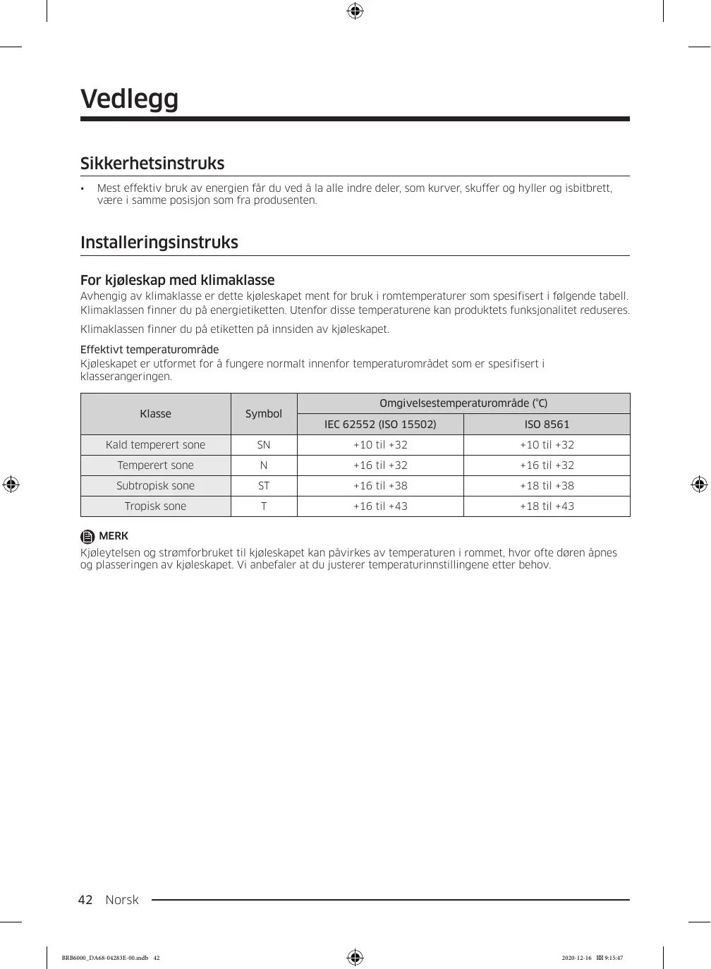 Mest effektiv bruk av energien får du ved å la alle indre deler, som kurver, skuffer og hyller og isbitbrett, være i samme posisjon som fra produsenten. Installeringsinstruks For kjøleskap med klimaklasse Avhengig av klimaklasse er dette kjøleskapet ment for bruk i romtemperaturer som spesifisert i følgende tabell. Klimaklassen finner du på energietiketten. Utenfor disse temperaturene kan produktets funksjonalitet reduseres. Klimaklassen finner du på etiketten på innsiden av kjøleskapet. Effektivt temperaturområde Kjøleskapet er utformet for å fungere normalt innenfor temperaturområdet som er spesifisert i klasserangeringen. Klasse Symbol Kald temperert sone Temperert sone Omgivelsestemperaturområde (°C) IEC 62552 (ISO 15502) ISO 8561