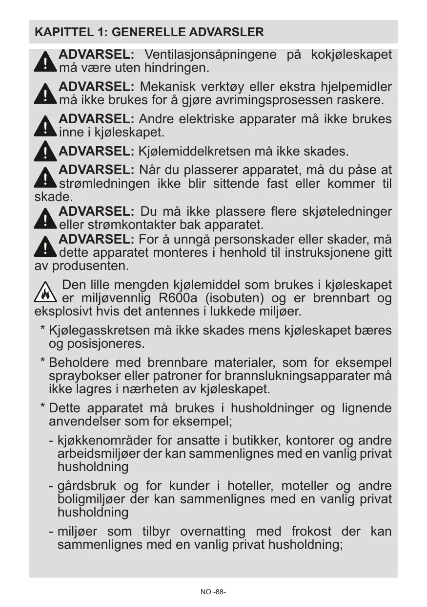 PARTIE -6: AVANT D'APPELER LE SERVICE APRÈS-VENTE35 PARTIE -7: ASTUCES D'ÉCONOMIES D'ÉNERGIE36 PARTIE -8: D ONNÉES TECHNIQUES36 PARTIE -9: SERVICE ET ASSISTANCE À LA CLIENTÈLE36 AVERTISSEMENT: N'utilisez pas d'appareils électriques dans le compartiment réservé à la conservation des aliments. Seuls les appareils électriques recommandés par le fabricant font exception. AVERTISSEMENT: N'endommagez pas le circuit réfrigérant. AVERTISSEMENT: Lorsque vous positionnez l'appareil, assurez-vous que le câble d'alimentation n'est pas coincé ou endommagé. AVERTISSEMENT: N'installez pas plusieurs prises de courant portatives ou alimentations portatives à l'arrière de l'appareil. AVERTISSEMENT: Pour éviter tout risque lié à l'instabilité de l'appareil, fixez-le suivant les instructions prescrites. Si votre appareil utilise le réfrigérant R600a (pour le savoir, reportez-vous à l'étiquette figurant en bas à gauche du compartiment intérieur) vous devez faire attention pendant le transport et l'installation afin d'éviter d'endommager le circuit de refroidissement. Bien que le réfrigérant R600a soit un gaz naturel qui respecte l'environnement, il est explosif. En cas de fuite causée par la défaillance des pièces grâce auxquelles le refroidissement est possible, éloignez votre congélateur des flammes nues et des sources de chaleur, puis ventilez la salle dans laquelle se trouve l'appareil pendant quelques minutes. * Pendant le déplacement et l'installation de votre congélateur, prenez soin de ne pas endommager le circuit du gaz de refroidissement. * Ne pas stocker dans cet appareil des substances explosives telles que des aérosols contenant des gaz propulseurs inflammables * Cet appareil est conçu pour être utilisé à domicile et dans les endroits similaires tels que : FR -26-