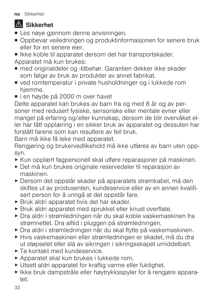 Hvis vaskemaskinen eller strømledningen er skadet, på dra ut støpselet eller slå av sikringen i sikringsskapet umiddelbart.