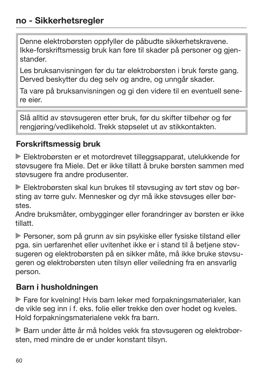 no - Sikkerhetsregler Bruk Ikke ta på børstevalsen når den går rundt. Unngå å komme i nærheten av hodet når du støvsuger med elektrobørsten. Hold deler som gardiner, klær, sjal o.l. unna elektrobørsten. Ikke støvsug brennende eller glødende gjenstander, f.eks. sigaretter eller tilsynelatende sloknet aske eller kull. Ikke støvsug lettantennelige eller eksplosive stoffer eller gasser og ikke støvsug på steder hvor slike stoffer oppbevares. Ikke støvsug opp væsker eller fuktig smuss. Tepper og teppegulv som er våtrenset eller behandlet med sjampo, må tørke helt før de støvsuges. Miele kan ikke gjøres ansvarlig for skader som skyldes ikke forskriftsmessig bruk, feil betjening eller at sikkerhetsreglene ikke er fulgt.