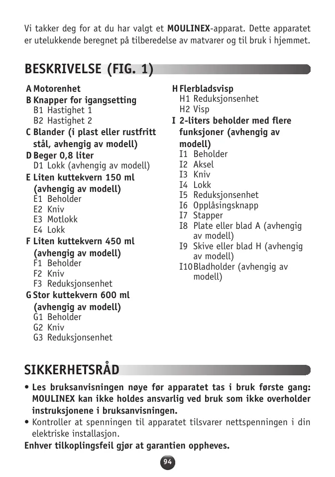 Vi takker deg for at du har valgt et MOULINEX-apparat. Dette apparatet er utelukkende beregnet på tilberedelse av matvarer og til bruk i hjemmet. BESKRIVELSE (FIG. 1) A Motorenhet B Knapper for igangsetting B1 Hastighet 1 B2 Hastighet 2 C Blander (i plast eller rustfritt stål, avhengig av modell) D Beger 0,8 liter D1 Lokk (avhengig av modell) E Liten kuttekvern 150 ml (avhengig av modell) E1 Beholder E2 Kniv E3 Motlokk E4 Lokk F Liten kuttekvern 450 ml (avhengig av modell) F1 Beholder F2 Kniv F3 Reduksjonsenhet G Stor kuttekvern 600 ml (avhengig av modell) G1 Beholder G2 Kniv G3 Reduksjonsenhet H Flerbladsvisp H1 Reduksjonsenhet H2 Visp I 2-liters beholder med flere funksjoner (avhengig av modell) I1 Beholder I2 Aksel I3 Kniv I4 Lokk I5 Reduksjonsenhet I6 Opplåsingsknapp I7 Stapper I8 Plate eller blad A (avhengig av modell) I9 Skive eller blad H (avhengig av modell) I10Bladholder (avhengig av modell) SIKKERHETSRÅD
