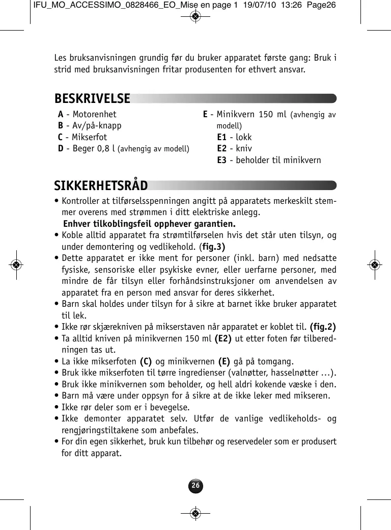 Cualquier error de conexión anularía la garantía. • Desconecte siempre su aparato si lo deja sin vigilancia, cuando lo desmonta o durante su mantenimiento. (fig.3) • Este aparato no está previsto para ser utilizado por personas (incluido los niños) cuyas capacidades físicas, sensoriales o mentales son reducidas, o por personas privadas de experiencia o de conocimiento, excepto si pudieran beneficiarse, por medio de otra persona responsable de su seguridad, de una vigilancia o de instrucciones previas concernientes a la utilización del aparato. • Conviene vigilar a los niños para asegurarse que no jueguen con el aparato. • Nunca manipule la cuchilla del pie mezclador si el aparato está enchufado. (fig.2) • Manipule siempre la cuchilla de la mini-picadora 150 ml (E2) por su base antes de tomar su preparación. • Nunca haga funcionar el pie mezclador (C) y la mini-picadora (E) en vacío. • Nunca haga funcionar el pie mezclador con ingredientes secos ( nueces, avellanas...). • No utilice la mini-picadora como recipiente y nunca vierta líquidos hirviendo en su interior. • Introduzca el pie de la batidora en la preparación, sumerja sólo la campana, ponga el aparato en marcha y deje que se vaya haciendo la preparación. • No es necesario machacar la preparación para obtener un buen resultado.
