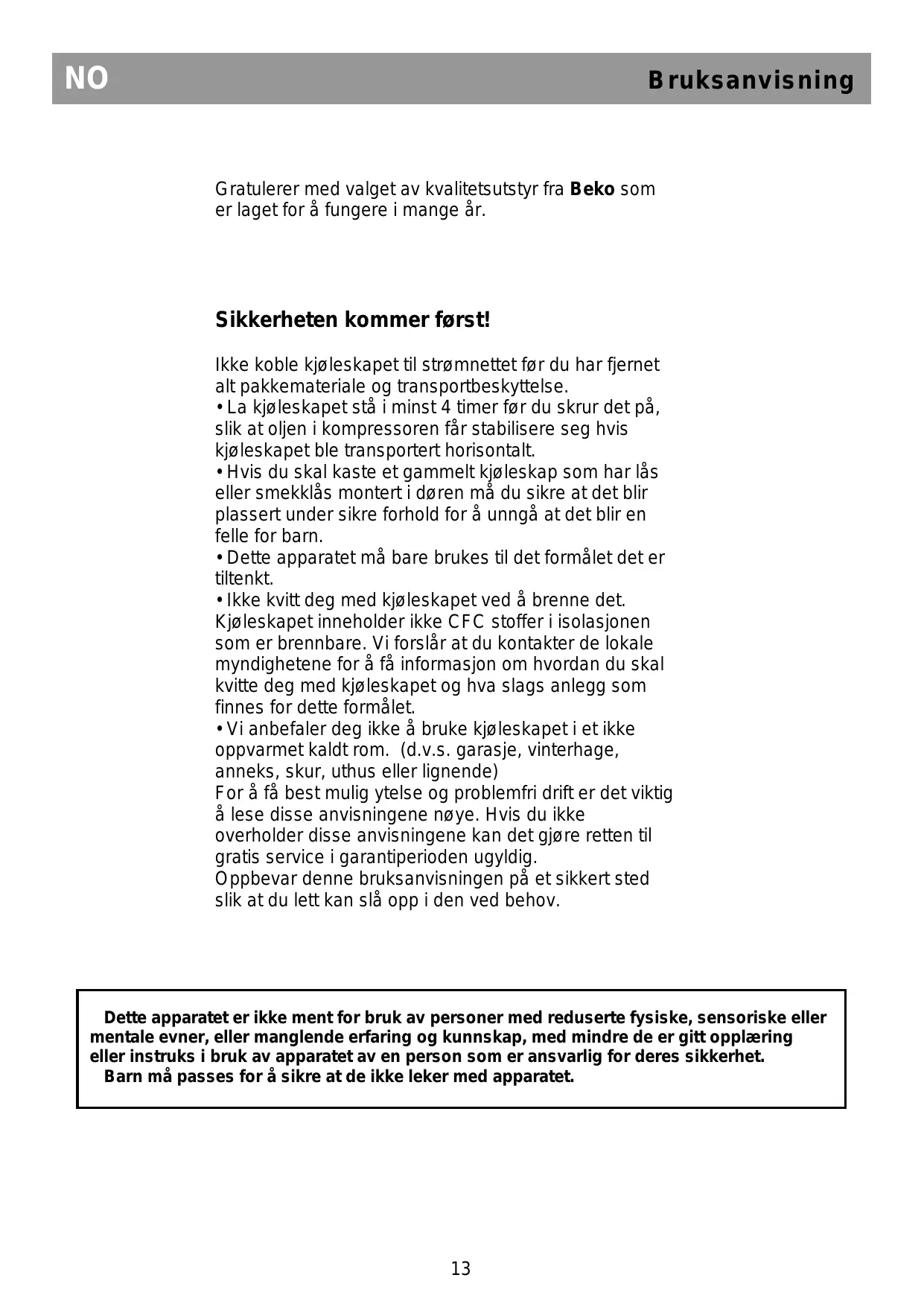 - Vi anbefaler deg ikke å bruke kjøleskapet i et ikke oppvarmet kaldt rom. (d.v.s. garasje, vinterhage, anneks, skur, uthus eller lignende) For å få best mulig ytelse og problemfri drift er det viktig å lese disse anvisningene nøye. Hvis du ikke overholder disse anvisningene kan det gjøre retten til gratis service i garantiperioden ugyldig. Oppbevar denne bruksanvisningen på et sikkert sted slik at du lett kan slå opp i den ved behov. Dette apparatet er ikke ment for bruk av personer med reduserte fysiske, sensoriske eller mentale evner, eller manglende erfaring og kunnskap, med mindre de er gitt opplæring eller instruks i bruk av apparatet av en person som er ansvarlig for deres sikkerhet. Barn må passes for å sikre at de ikke leker med apparatet.
