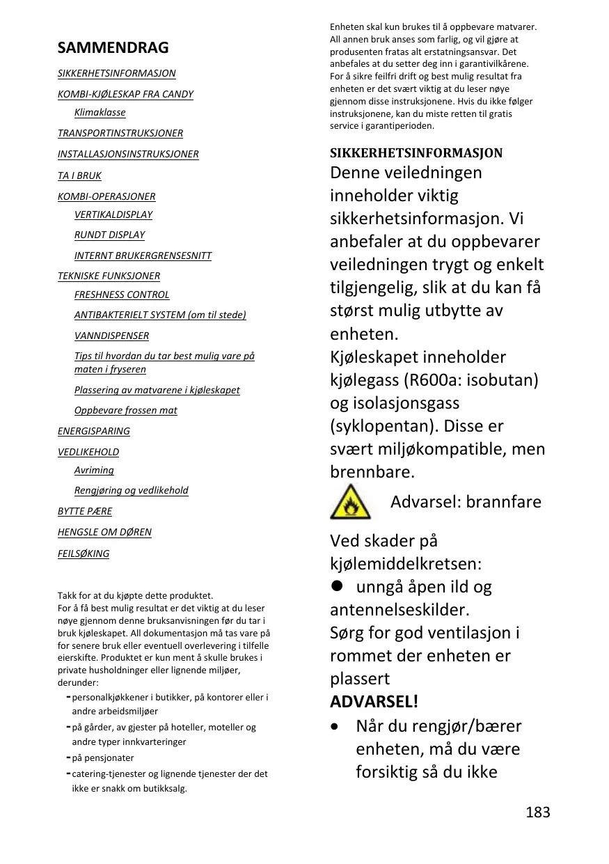 FEILSØKING Takk for at du kjøpte dette produktet. For å få best mulig resultat er det viktig at du leser nøye gjennom denne bruksanvisningen før du tar i bruk kjøleskapet. All dokumentasjon må tas vare på for senere bruk eller eventuell overlevering i tilfelle eierskifte. Produktet er kun ment å skulle brukes i private husholdninger eller lignende miljøer, derunder: - personalkjøkkener i butikker, på kontorer eller i andre arbeidsmiljøer - på gårder, av gjester på hoteller, moteller og andre typer innkvarteringer - på pensjonater - catering-tjenester og lignende tjenester der det Enheten skal kun brukes til å oppbevare matvarer. All annen bruk anses som farlig, og vil gjøre at produsenten fratas alt erstatningsansvar. Det anbefales at du setter deg inn i garantivilkårene. For å sikre feilfri drift og best mulig resultat fra enheten er det svært viktig at du leser nøye gjennom disse instruksjonene. Hvis du ikke følger instruksjonene, kan du miste retten til gratis service i garantiperioden. SIKKERHETSINFORMASJON Denne veiledningen inneholder viktig sikkerhetsinformasjon. Vi anbefaler at du oppbevarer veiledningen trygt og enkelt tilgjengelig, slik at du kan få størst mulig utbytte av enheten. Kjøleskapet inneholder kjølegass (R600a: isobutan) og isolasjonsgass (syklopentan). Disse er svært miljøkompatible, men brennbare. Advarsel: brannfare Ved skader på kjølemiddelkretsen: unngå åpen ild og antennelseskilder. Sørg for god ventilasjon i rommet der enheten er plassert ADVARSEL! Når du rengjør/bærer enheten, må du være forsiktig så du ikke ikke er snakk om butikksalg.