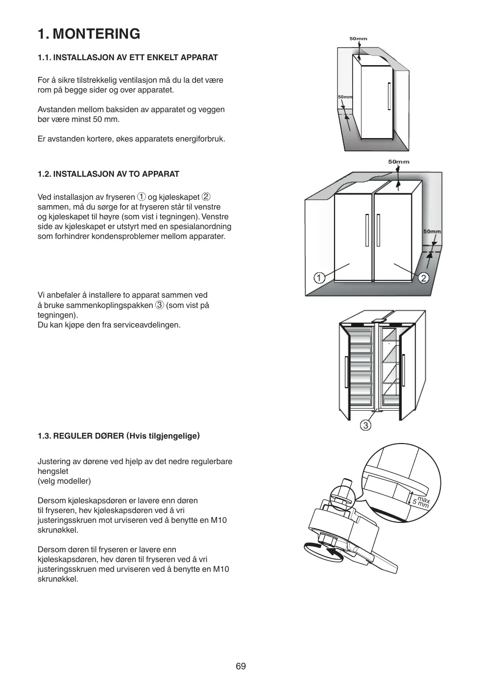 1.2. INSTALLATION DE DEUX APPAREILS Durant l'installation du congélateur 1 et du réfrigérateur 2 , assurez-vous que le congélateur est placé à gauche et le réfrigérateur à droite (comme illustré sur l'image). Sur le côté gauche du réfrigérateur se trouve un dispositif spécial permettant d'éviter les problèmes de condensation entre les appareils.