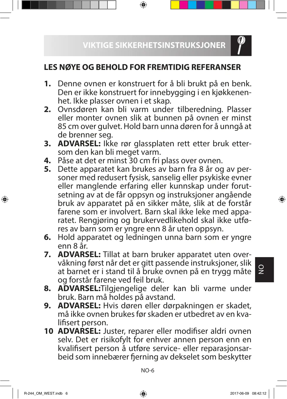 NO-7 R-244_OM_WEST.indb 7 2017-06-09 08:42:12 støpslet på den elektriske ledningen trekkes ut av kontakten, og døren må holdes lukket for å hindre oppblussing av flammer.