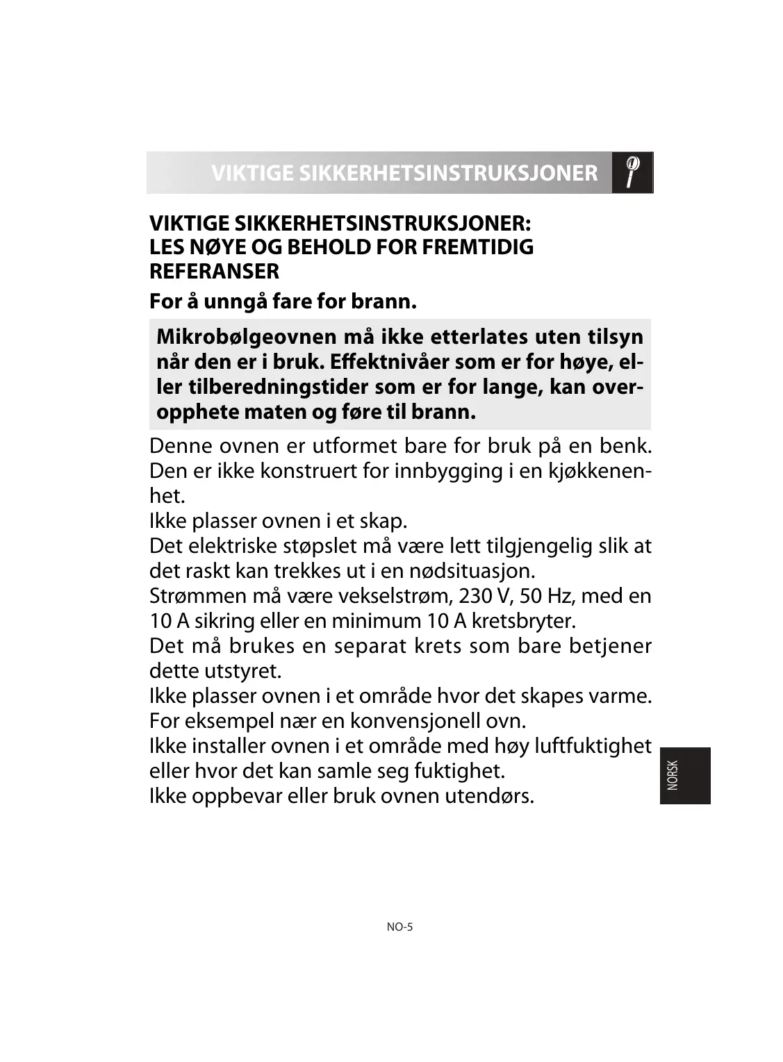 Ce four est conçu pour être uniquement utilisé sur un plan de travail de cuisine. Il n'est pas conçu pour être installé dans un élément de cuisine. Veuillez ne pas placer le four dans un placard. La prise secteur doit être facilement accessible, afin que la fiche du cordon d’alimentation puisse être aisément débranchée en cas d’urgence. La tension d’alimentation doit être égale à 230 V, 50 Hz avec un fusible de distribution de 10 A minimum, ou un disjoncteur de 10 A minimum. Ce four doit être alimenté à partir d’un circuit électrique indépendant. Veuillez ne pas placer votre four à proximité d'une zone génératrice de chaleur. Par exemple, près d'un four à cuisson conventionnelle. Ne placez pas ce four dans une atmosphère à humidité élevée ou bien où l’humidité peut s'accumuler. Ne rangez pas et n’utilisez pas le four à l’extérieur. F-5