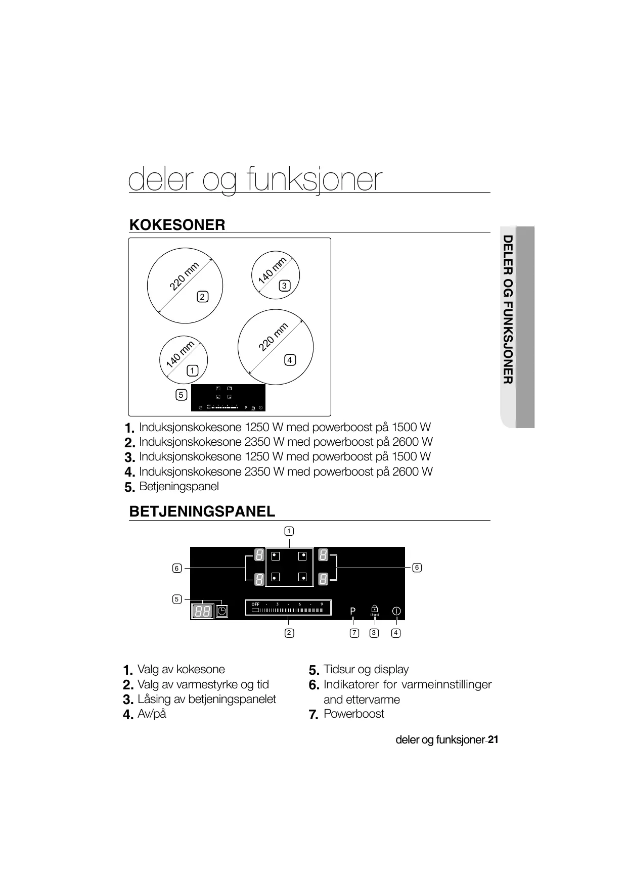1. Induksjonskokesone 1250 W med powerboost på 1500 W 2. Induksjonskokesone 2350 W med powerboost på 2600 W 3. Induksjonskokesone 1250 W med powerboost på 1500 W 4. Induksjonskokesone 2350 W med powerboost på 2600 W 5. Betjeningspanel