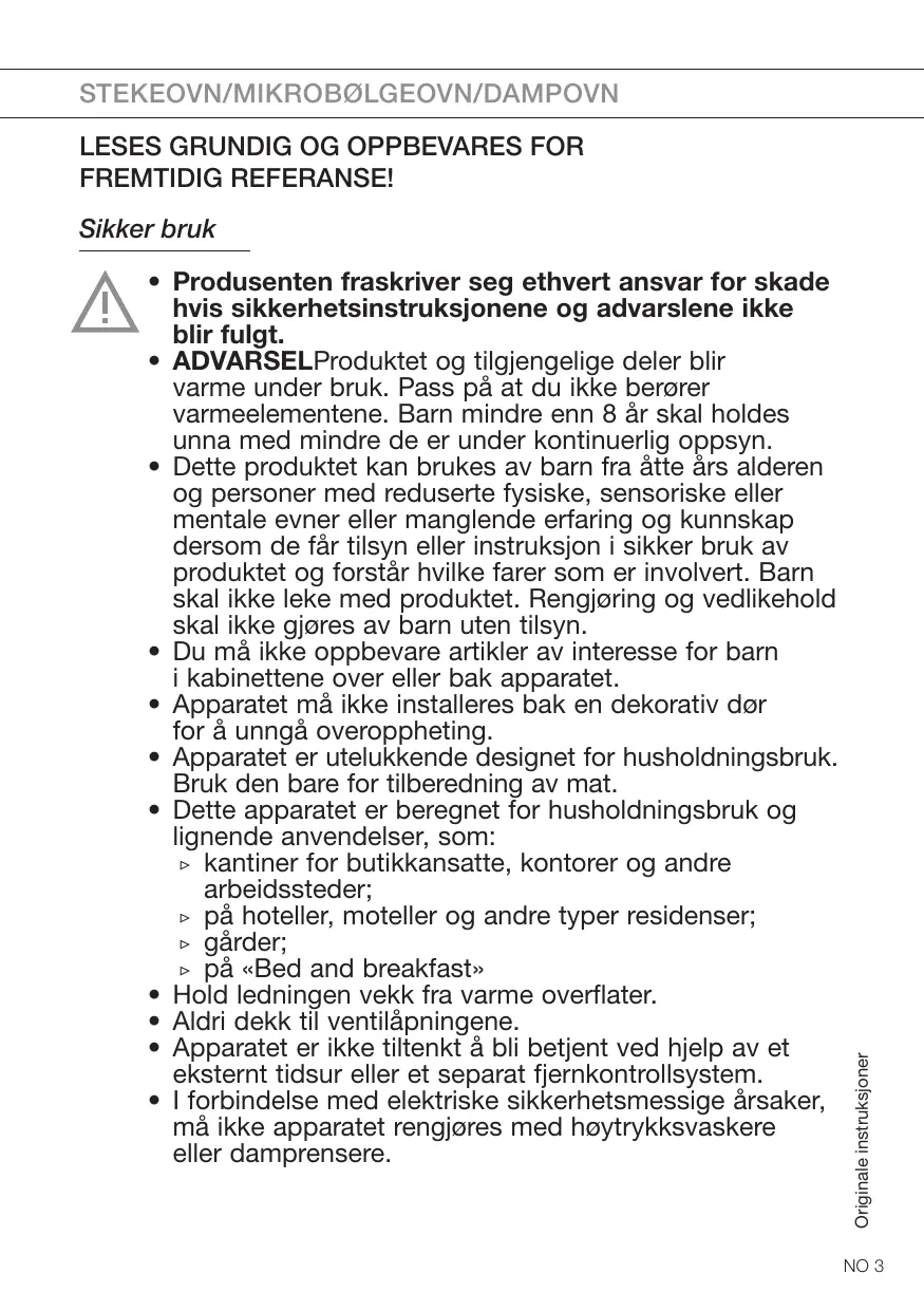 - I forbindelse med elektriske sikkerhetsmessige årsaker, må ikke apparatet rengjøres med høytrykksvaskere eller damprensere. Originale instruksjoner Sikker bruk NO 3