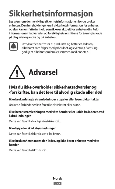 Le non-respect des consignes de sécurité peut entraîner des blessures graves, voire la mort N’utilisez pas de prises et de cordons d’alimentation endommagé(e)s ou de prises électriques mal fixées Les branchements non sécurisés engendrent un risque d’électrocution ou d’incendie. Ne touchez pas le cordon d’alimentation avec les mains mouillées et ne déconnectez pas le chargeur en tirant sur le cordon Vous risquez de vous électrocuter. Ne tordez et n’endommagez pas le cordon d’alimentation Vous risquez de vous électrocuter ou de provoquer un incendie. N’utilisez pas l’appareil avec les mains mouillées ou lorsque celui-ci est en cours de chargement Vous risquez de vous électrocuter.