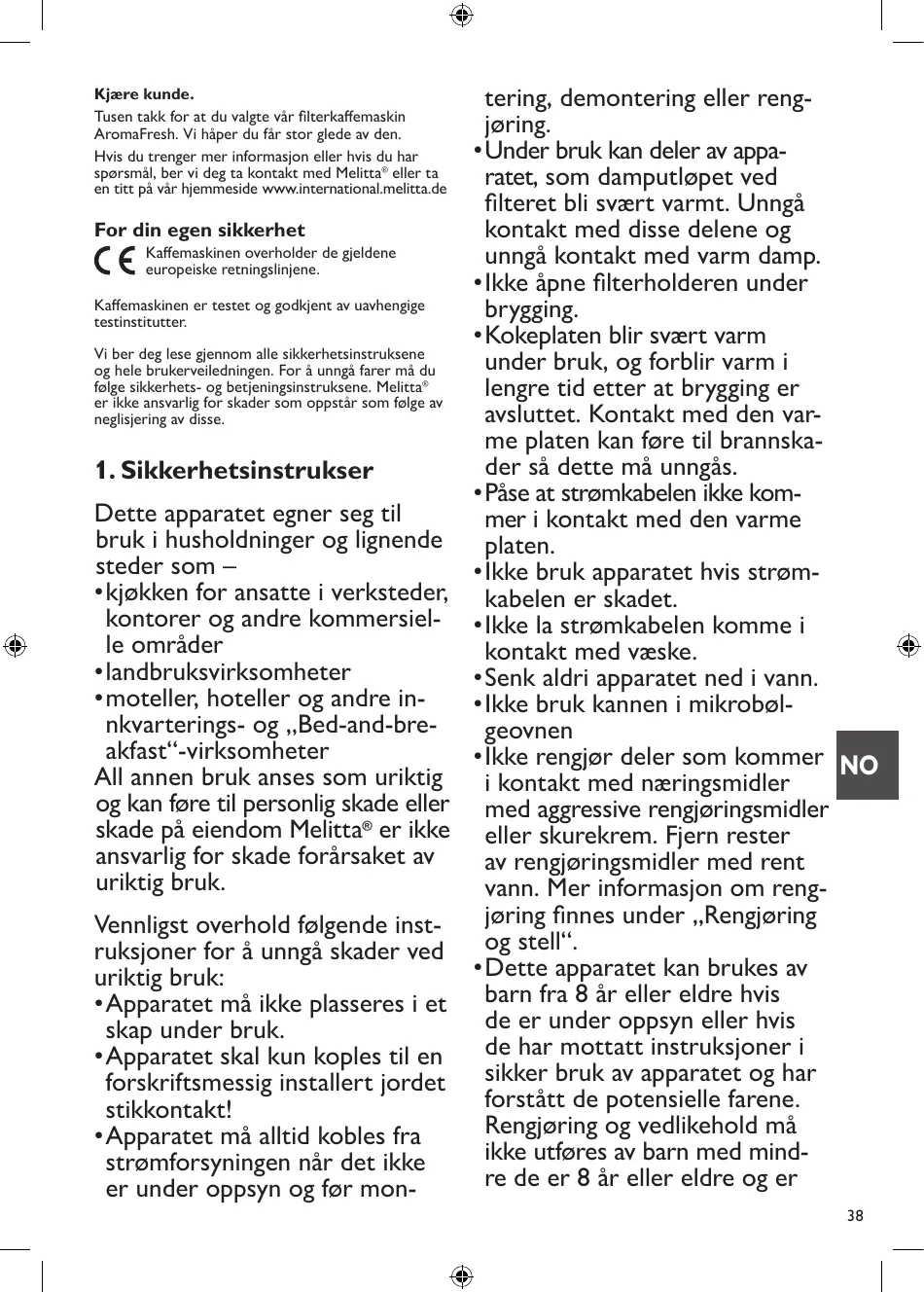tering, demontering eller rengjøring. • Under bruk kan deler av apparatet, som damputløpet ved filteret bli svært varmt. Unngå For din egen sikkerhet kontakt med disse delene og Kaffemaskinen overholder de gjeldene unngå kontakt med varm damp. europeiske retningslinjene. • Ikke åpne filterholderen under Kaffemaskinen er testet og godkjent av uavhengige brygging. testinstitutter. • Kokeplaten blir svært varm Vi ber deg lese gjennom alle sikkerhetsinstruksene under bruk, og forblir varm i og hele brukerveiledningen. For å unngå farer må du følge sikkerhets- og betjeningsinstruksene. Melitta lengre tid etter at brygging er er ikke ansvarlig for skader som oppstår som følge av avsluttet. Kontakt med den varneglisjering av disse. me platen kan føre til brannskader så dette må unngås. 1. Sikkerhetsinstrukser • Påse at strømkabelen ikke komDette apparatet egner seg til mer i kontakt med den varme bruk i husholdninger og lignende platen. steder som – • Ikke bruk apparatet hvis strøm• kjøkken for ansatte i verksteder, kabelen er skadet. kontorer og andre kommersiel- • Ikke la strømkabelen komme i le områder kontakt med væske. • landbruksvirksomheter • Senk aldri apparatet ned i vann. • moteller, hoteller og andre in• Ikke bruk kannen i mikrobølnkvarterings- og „Bed-and-bregeovnen akfast“-virksomheter • Ikke rengjør deler som kommer NO All annen bruk anses som uriktig i kontakt med næringsmidler og kan føre til personlig skade eller med aggressive rengjøringsmidler skade på eiendom Melitta® er ikke eller skurekrem. Fjern rester ansvarlig for skade forårsaket av av rengjøringsmidler med rent uriktig bruk. vann. Mer informasjon om rengjøring finnes under „Rengjøring Vennligst overhold følgende instog stell“. ruksjoner for å unngå skader ved • Dette apparatet kan brukes av uriktig bruk: barn fra 8 år eller eldre hvis • Apparatet må ikke plasseres i et de er under oppsyn eller hvis skap under bruk. de har mottatt instruksjoner i • Apparatet skal kun koples til en forskriftsmessig installert jordet sikker bruk av apparatet og har forstått de potensielle farene. stikkontakt! Rengjøring og vedlikehold må • Apparatet må alltid kobles fra ikke utføres av barn med mindstrømforsyningen når det ikke re de er 8 år eller eldre og er er under oppsyn og før monKjære kunde. Tusen takk for at du valgte vår filterkaffemaskin AromaFresh. Vi håper du får stor glede av den. Hvis du trenger mer informasjon eller hvis du har spørsmål, ber vi deg ta kontakt med Melitta® eller ta en titt på vår hjemmeside www.international.melitta.de